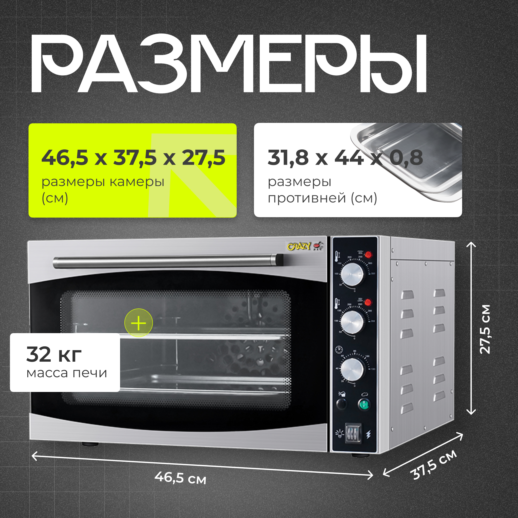 Печь конвекционная мини Crazy Pan CP-EC06THS подходит для использования на предприятиях общественного питания и применяется для приготовления широкого спектра блюд из мяса, рыбы, овощей, и, конечно же, для выпечки различных хлебобулочных изделий. Особенности Печь оснащена подсветкой. Количество ТЭНов 2шт. В комплект входит 2 противня. Вилка для подключения к электропитанию.