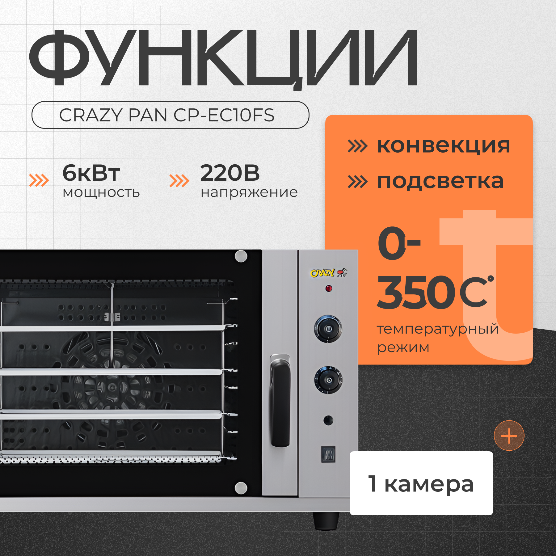 Профессиональная конвекционная печь Crazy Pan CP-EC10FS - это незаменимый помощник на предприятиях общественного питания. Она прекрасно подходит для приготовления широкого спектра блюд из мяса, рыбы, овощей и выпечки различных хлебобулочных изделий.