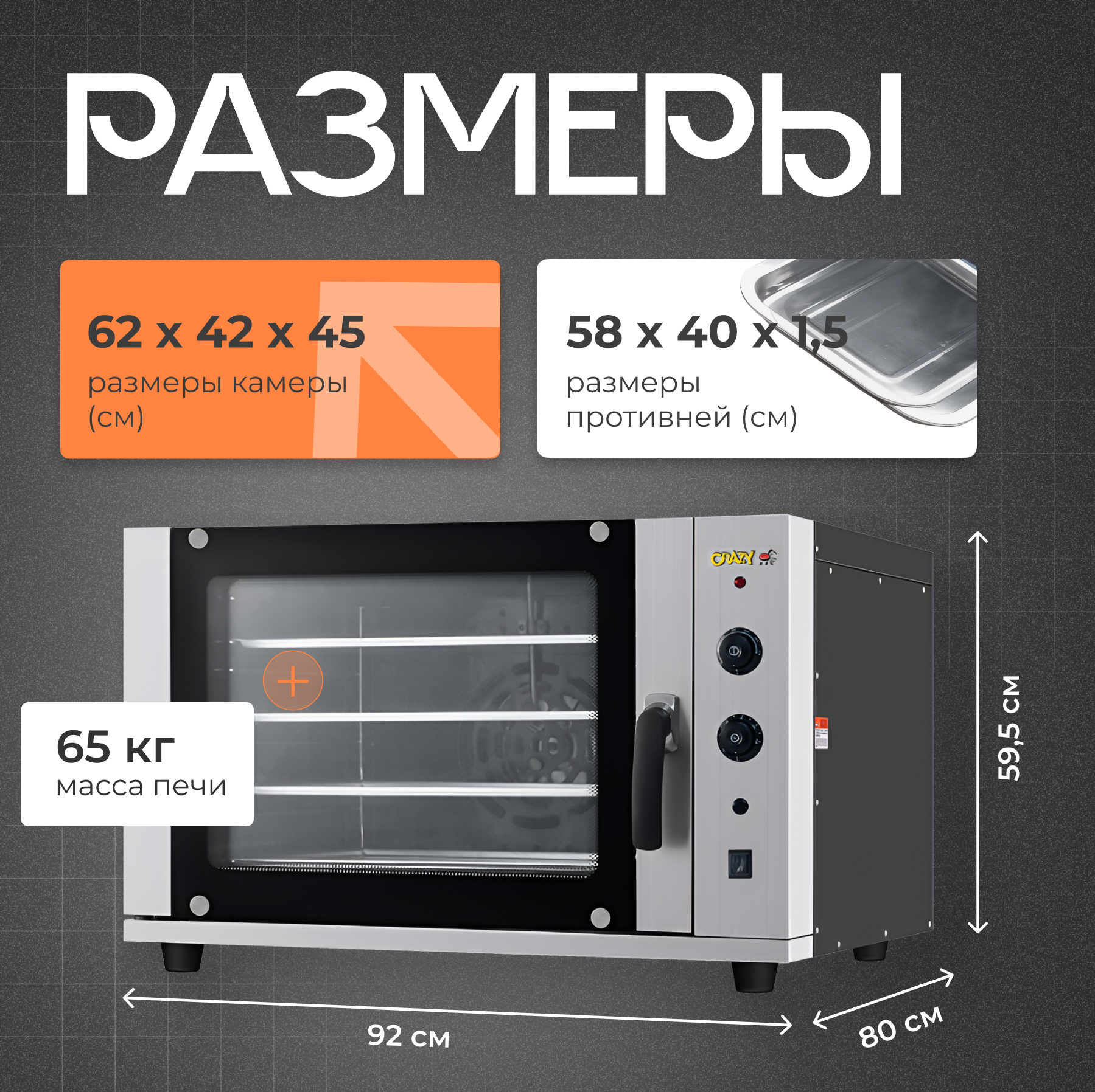 Размеры печи составляют 920x800x595 мм, а вес - 65 кг. Это делает ее удобной для транспортировки и установки на предприятиях общественного питания.