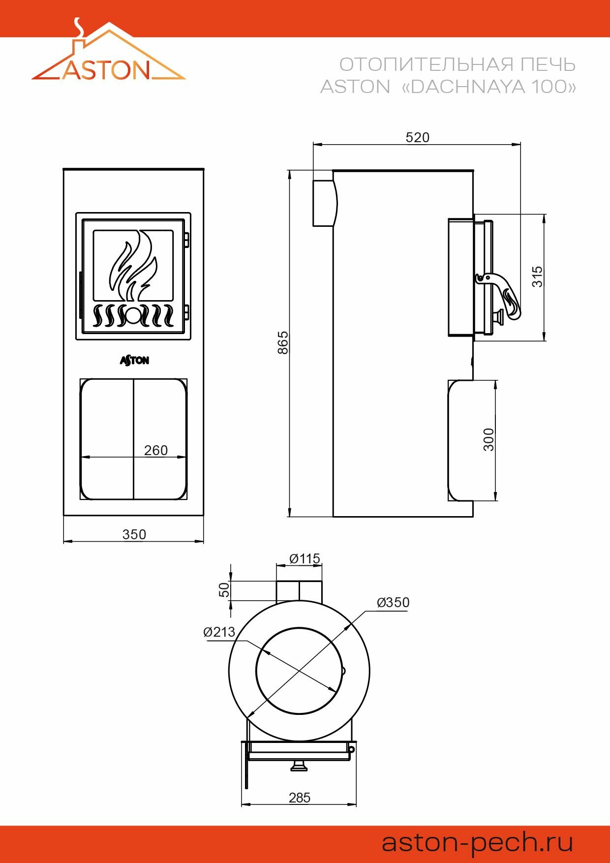 Отопительная печь ASTON " Dachnaya 100" имеет цилиндрическую форму, с удобной глухой стальной дверью и съёмной верхней конфоркой из особо прочной стали. Аккуратная, компактная и эстетичная печь рассчитана на прогрев помещений объёмом до 100 кубических метров. На печи можно готовить или разогревать еду. Стальная конфорка рассчитана на установку различной посуды, в том числе и большого объёма. Для ускорения прогрева посуды и приготовления пищи среднюю часть конфорки можно снимать. Печь оснащена глухой стальной дверью Астон с возможностью регулирования подачи воздуха и силы горения огня. Полотно двери декорировано узором в дизайне астон. Топка печи стальная, изготовлена из стали марки 09Г2С. На дне топочной камеры размещён колосник для подачи воздуха в зону горения. Колосник в топке размещён поперечно. Зольный ящик захватывает всё поддувальное пространство, в него попадает зола из топки. Ящик вместе с золой и углями легко вынимается из печи для удобной уборки поддувального пространства. Выход дымоход диаметром 115 миллиметров размещён на задней стенке топки, вверху.
