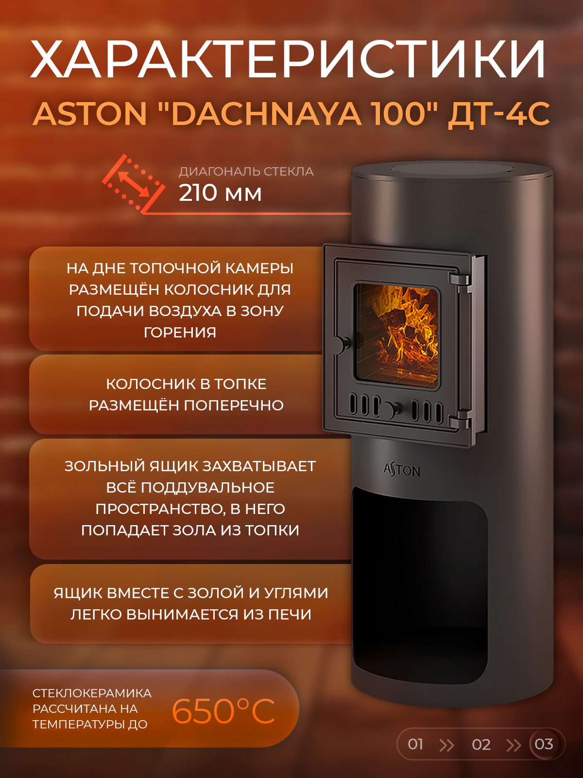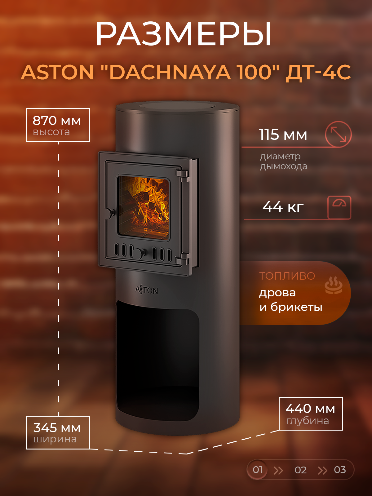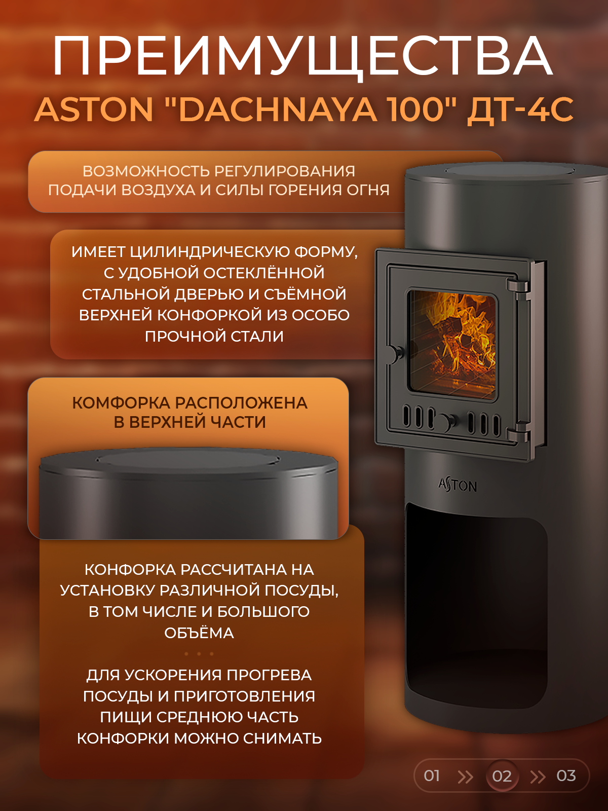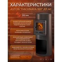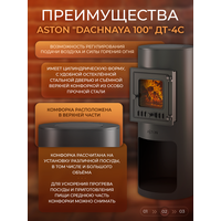 Отопительная печь ASTON " Dachnaya 100" ДТ-4С имеет цилиндрическую форму, с удобной остеклённой чугунной дверью и съёмной верхней конфоркой из чугуна. Аккуратная, компактная и эстетичная печь рассчитана на прогрев помещений объёмом до 100 кубических метров. На печи можно готовить или разогревать еду.Чугунная конфорка рассчитана на установку различной посуды, в том числе и большого объёма. Для ускорения прогрева посуды и приготовления пищи среднюю часть конфорки можно снимать.Печь оснащена чугунной дверью артикул ДТ-4С Астон с возможностью регулирования подачи воздуха и силы горения огня. Диагональ стекла – 21 см. Стеклокерамика рассчитана на температуры до 650°C.Топка печи стальная, изготовлена из стали марки 09Г2С.На дне топочной камеры размещён колосник для подачи воздуха в зону горения. Колосник в топке размещён поперечно.Зольный ящик захватывает всё поддувальное пространство, в него попадает зола из топки. Ящик вместе с золой и углями легко вынимается из печи.Выход дымоход диаметром 115 миллиметров размещён на задней стенке топки, вверху. Отопительная печь ASTON Dachnaya 100 ДТ-4С - это эстетичное и компактное обогревательное устройство, предназначенное для помещений объемом до 100 кубических метров. Печь имеет цилиндрическую форму и удобную остекленную чугунную дверь, а также съемную верхнюю конфорку из чугуна. Благодаря возможности готовить и разогревать еду на печи, она станет не только источником тепла, но и функциональным элементом интерьера.