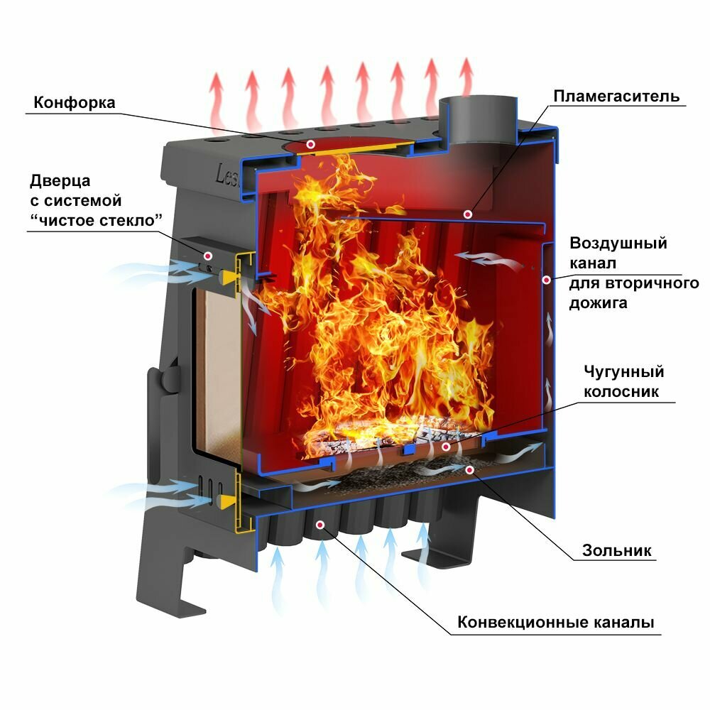 Астон Лесная - отопительная печь конвекционного типа, изготовленная из особо прочной котловой стали. Печь предназначена для обогрева помещений объёмом до 150 кубических метров. Конструкция печи включает в себя топку с пламегасителем и каналом вторичного дожига. Стенки топки выполнены из металлических труб, являющихся эффективными конвекторами. За счёт такой конструкции значительно ускоряется прогрев помещения, повышается эффективность сгорания топлива. Верхняя панель сделана с конвекционными отверстиями. В центре панели размещена конфорка для приготовления и подогрева еды. Дверь изготовлена из стали толщиной 2-3 мм. Она оснащена нижней системой подачи воздуха в поддувальное пространство. С помощью заслонки двери можно регулировать интенсивность горения дров в топке. Верхняя система подачи воздуха имеет собственную заслонку и обеспечивает чистоту стекла во время работы печи. Эта система называется «чистое стекло» и отсекает дымовые газы от передней части топки, предотвращая появление сажи и копоти.
