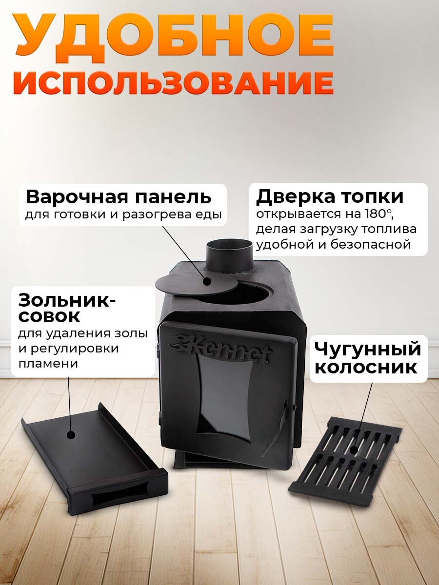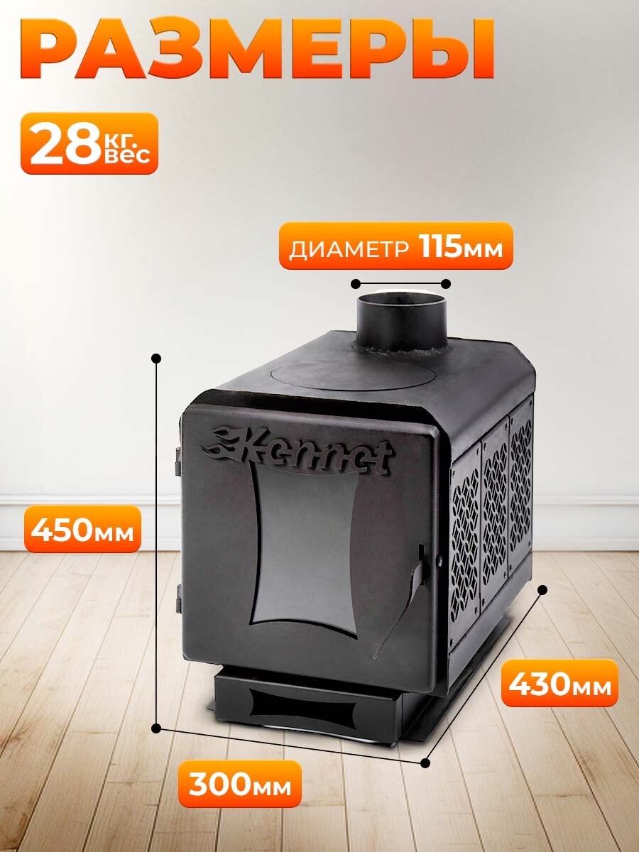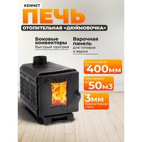 Отопительная печь Kennet Дюймовочка 50 - это конвекционная печь с варочной панелью, предназначенная для отопления помещений объемом до 50 м3. Любители дачного отдыха и владельцы частных домов оценят удобство и практичность данной печи. Она поможет снизить затраты на оплату газового или электрического теплоснабжения, предоставляя альтернативный источник тепла для вашего дома или дачи. Это отличное решение для тех, кто ищет автономную, надежную и доступную систему отопления. Работает на дровах Печь Kennet Дюймовочка 50 работает на дровах. Этот вид топлива является одним из самых доступных и обеспечивает эффективное отопление. Горение древесины не выделяет вредных выбросов и не оказывает негативного влияния на окружающую среду. Геометрия топки и боковые конвекторы печи, обеспечивают равномерное распределение тепла по помещению и минимизируют расход топлива. Компактная Габариты печи составляют 450 мм (высота) х 300 мм (ширина) х 430 мм (глубина). Вес печи составляет 28 кг. Благодаря компактным размерам печку можно легко установить даже в небольших помещениях. Диаметр дымохода равен 115 мм, и является стандартным, что делает монтаж дымохода проще и удобнее. Подходит для приготовления пищи Одной из особенностей печи является наличие варочной поверхности на верхней части панели с двумя стальными кругами. Это позволяет готовить и разогревать пищу прямо на печи, делая ее универсальным инструментом в домашней кухне или на даче. А наличие колец позволяет использовать посуду различного размера. Стильная Печь Kennet Дюймовочка 50 обладает оригинальным дизайном, который станет прекрасным дополнением к интерьеру вашего дома. Резные боковые панели придают ей элегантный и изысканный вид. В центре дверки есть окошко из жаропрочного стекла ROBAX®, толщиной 4,0 мм, которое позволяет наблюдать процесс горения внутри печи. Безопасная Дверца топки открывается на 180°, что упрощает процесс загрузки топлива. Механизм запирания надежно фиксирует дверку, обеспечивая безопасность и надежность использования. Под топкой расположен зольник с выдвижным ящиком, что облегчает удаление золы без прерывания работы печи. Поставляется с чугунным колосником Комплект поставки включает чугунный колосник. Благодаря колоснику топливо остается на нужном уровне и регулируется по мере необходимости, обеспечивая оптимальные условия горения. Он также способствует равномерному распределению воздуха и топлива внутри топочной камеры. Помогает достичь более полного и эффективного сгорания топлива, повышая КПД печи и минимизируя выбросы вредных веществ. Колосник также служит для защиты стенок печи от прямого контакта с топливом. Имеет дефлектор Печь отопительная Kennet Дюймовочка 50 имеет дефлектор, который отделяет пространство топливника от патрубка дымохода. Он экранирует прямое излучение на дымоход, предотвращает избыточную тягу и нормализует процесс горения. Печь отопительная Kennet Дюймовочка 50 представляет собой автономное отопительное решение, которое идеально подходит для отопления дома, дачи, гаража или других частных помещений. Она сочетает в себе функции отопительного прибора и плиты, обеспечивая максимальный комфорт и удобство в использовании.