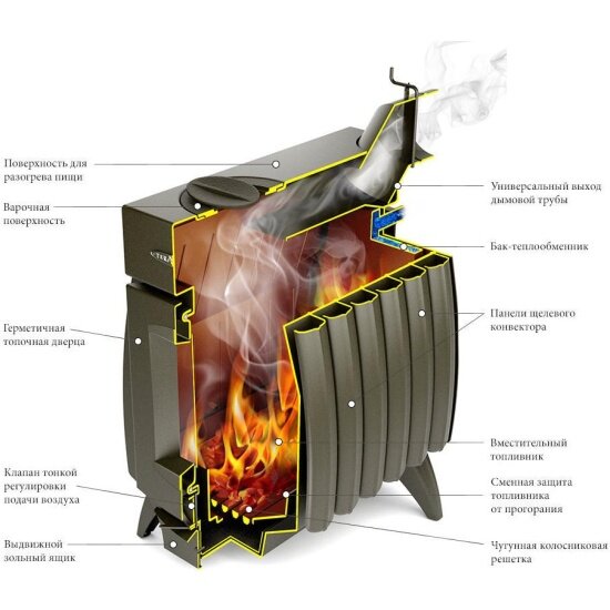 - Чугунная конфорка с двумя кольцами разных диаметров позволяет готовить пищу на открытом огне в посуде разного размера, загружать топливо сверху и прочищать от сажи верхнюю часть печи
