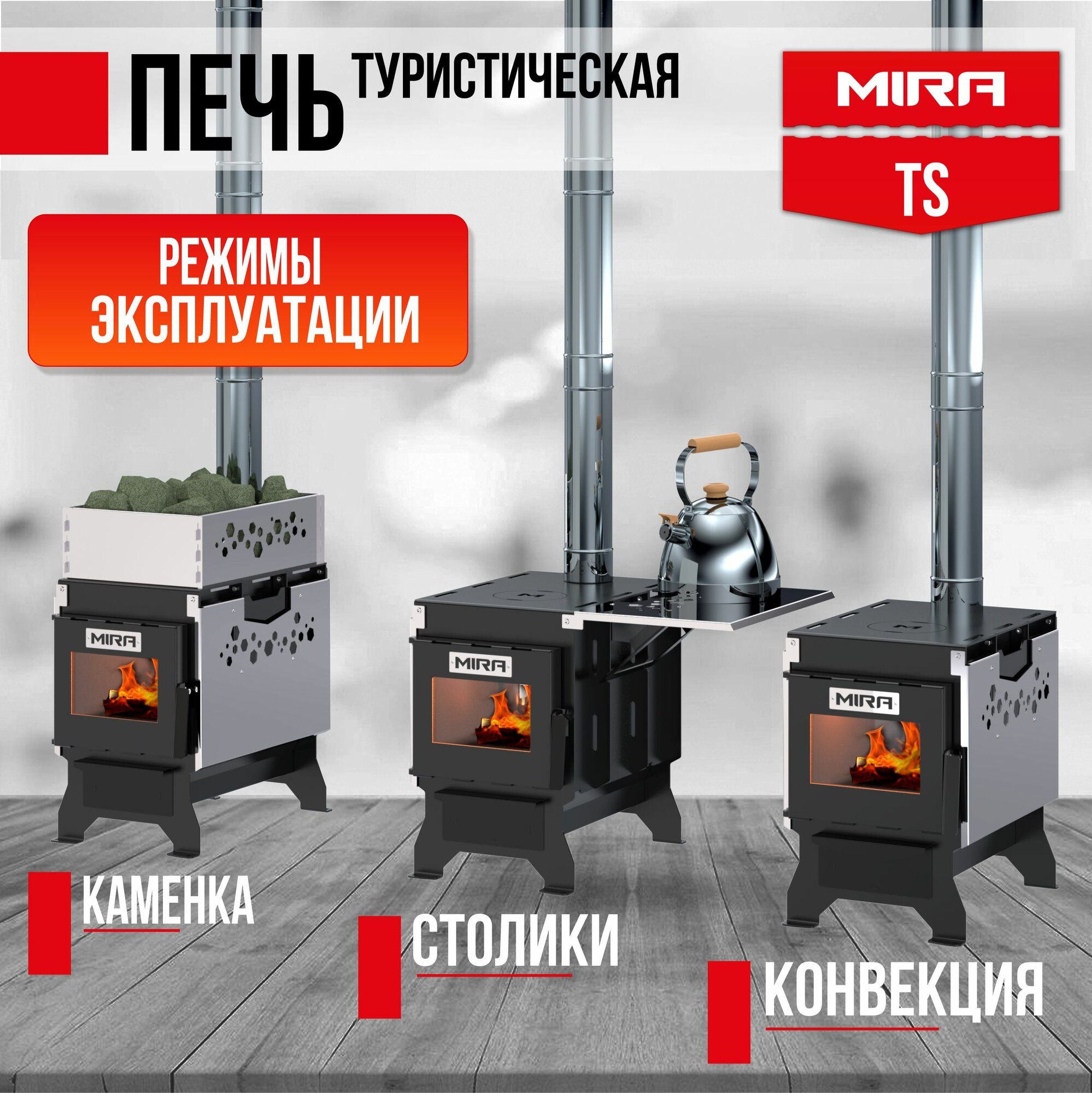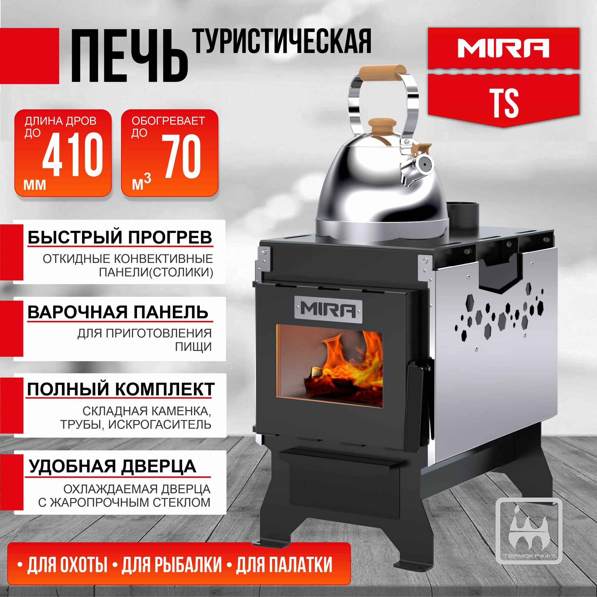 Печь отопительная походная для палатки, рыбалки, охоты, туризма MIRA TS Туристическая, сталь 3 мм, дверца со стеклом, дымоход и каменка: сравнение цен, характеристики, фото, актуальное наличие и цены.