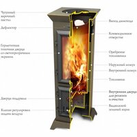 Интерьерная дровяная отопительно-варочная печь-камин Статика Тетра Мини сочетает в себе функционал отопительно-варочной печи и камина и рассчитана на объем отапливаемого помещения до 100 куб. м. Статика Тетра Мини является продолжением уже завоевавшей популярность линейки печей-каминов Статика . Так же, как и модель Тетра , Тетра Мини имеет фронтальное остекление. А отличается - конфигурацией, габаритными размерами и мощностью. Вертикальное расположение дров позволяет сократить габаритные размеры печи в плане и обеспечивает красивое горение дров по всей высоте топливника. Растапливать печь можно как классическим нижним розжигом, так и верхним розжигом, благодаря подаче горячего вторичного воздуха в верхний ярус топливника печи. Печь имеет две отдельные чугунные герметичные дверцы. Верхняя дверца топливника оснащена жаропрочным стеклом, а система чистое стекло , оставляет его чистым с момента растопки до окончания горения. Нижняя дверца зольного ящика позволяет регулировать приток воздуха при помощи заслонки и выбрать любой режим работы печи - от интенсивного до экономичного. Высокая дверца топливника позволяет максимально наполнить печь дровами для длительного непрерывного горения. Развитое оребрение боковых поверхностей топливника существенно увеличивает теплоотдачу, увеличивает его жесткость, исключая деформацию при работе печи. Внутренние панели, закрывающие ребра, обеспечивают дополнительное экранирование помещения от жесткого инфракрасного излучения. Снаружи топливник печи охвачен наружным кожухом. Конвекционные отверстия на боковых и задней стенках, отверстие в нижней части задней стенки и отверстие в центре основания печи обеспечивают свободную циркуляцию воздуха. За нижней чугунной дверцей располагается внутренняя дверца для розжига или очистки от золы. Два чугунных кружка варочной поверхности позволяют готовить пищу в посуде различного диаметра. Печь имеет характерный фирменный дизайн и выпускается в цвете черная бронза . Несколько слов от производителя: В средневековом замке Бутрон, расположенном в муниципалитете Гатика, в 19 км от Бильбао, есть каминный зал площадью 200 квадратных метров. И камин там, говорят, такой, что в нем можно зажарить целого быка после корриды. На обычных российских дачах площадь каминных залов, как правило, несколько меньше. И даже найти в них место под камин зачастую бывает не просто. Чтобы облегчить эту задачу, мы максимально сократили размеры камина в плане. Но при этом хорошенько вытянули его вверх, чтобы дрова в топку можно было закладывать вертикально. Да не какие-то коротыши, а здоровенные, полуметровые, как в большой настоящий камин. Зажарить в нем быка, конечно, сложно. Зато приготовить сочное ароматное жаркое в большой жаровне - очень даже легко.
