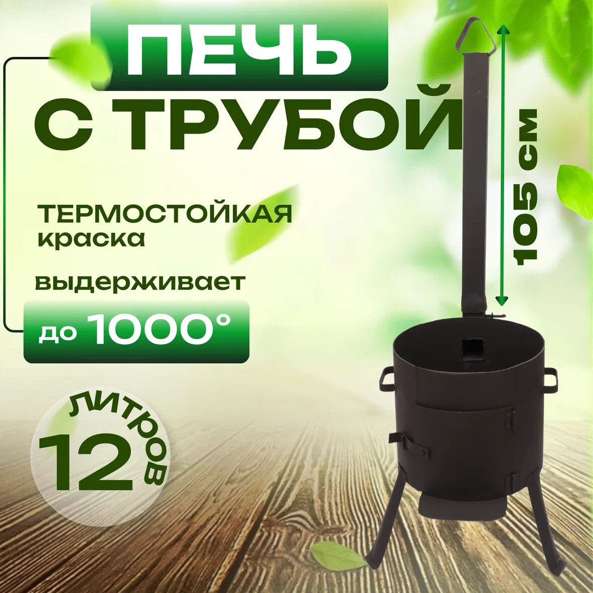 В комплекте с казаном идет разборная печка с трубой и дверцей. В трубу уходит весь дым, поэтому в еду не попадает сажа. Дверце помогает сохранить тепло, благодаря чему очаг быстрее прогревается. Ну а после использования его можно разобрать для более удобного хранения.