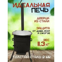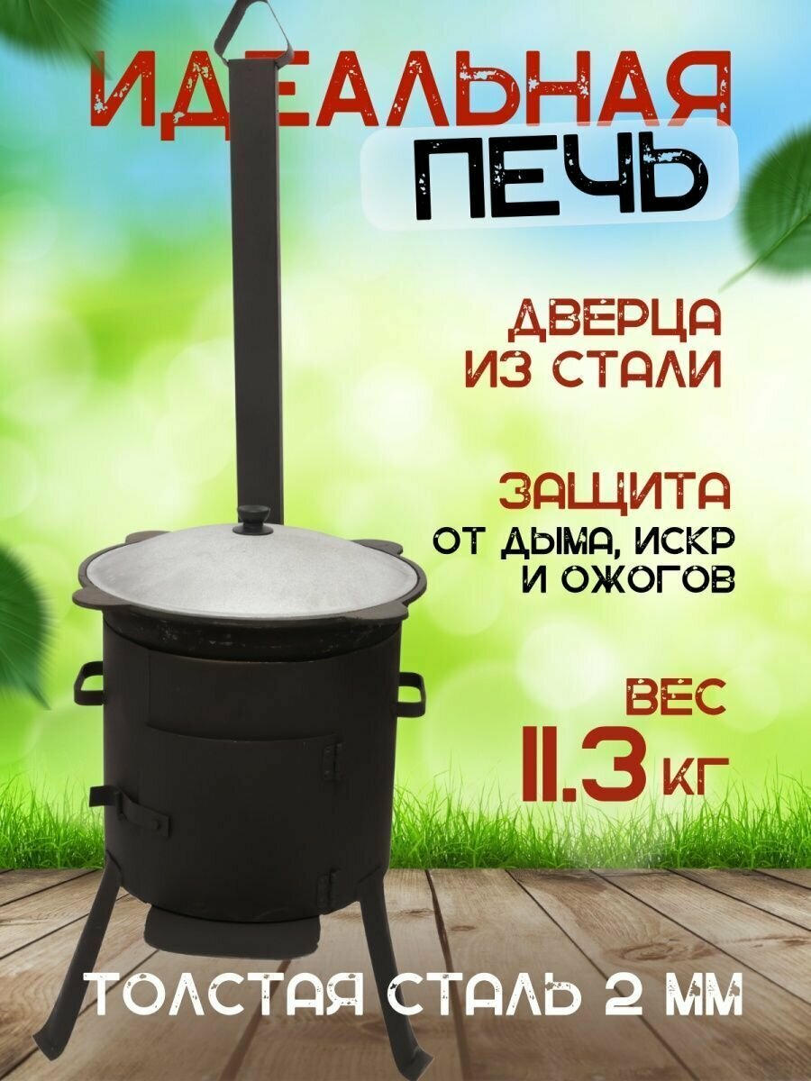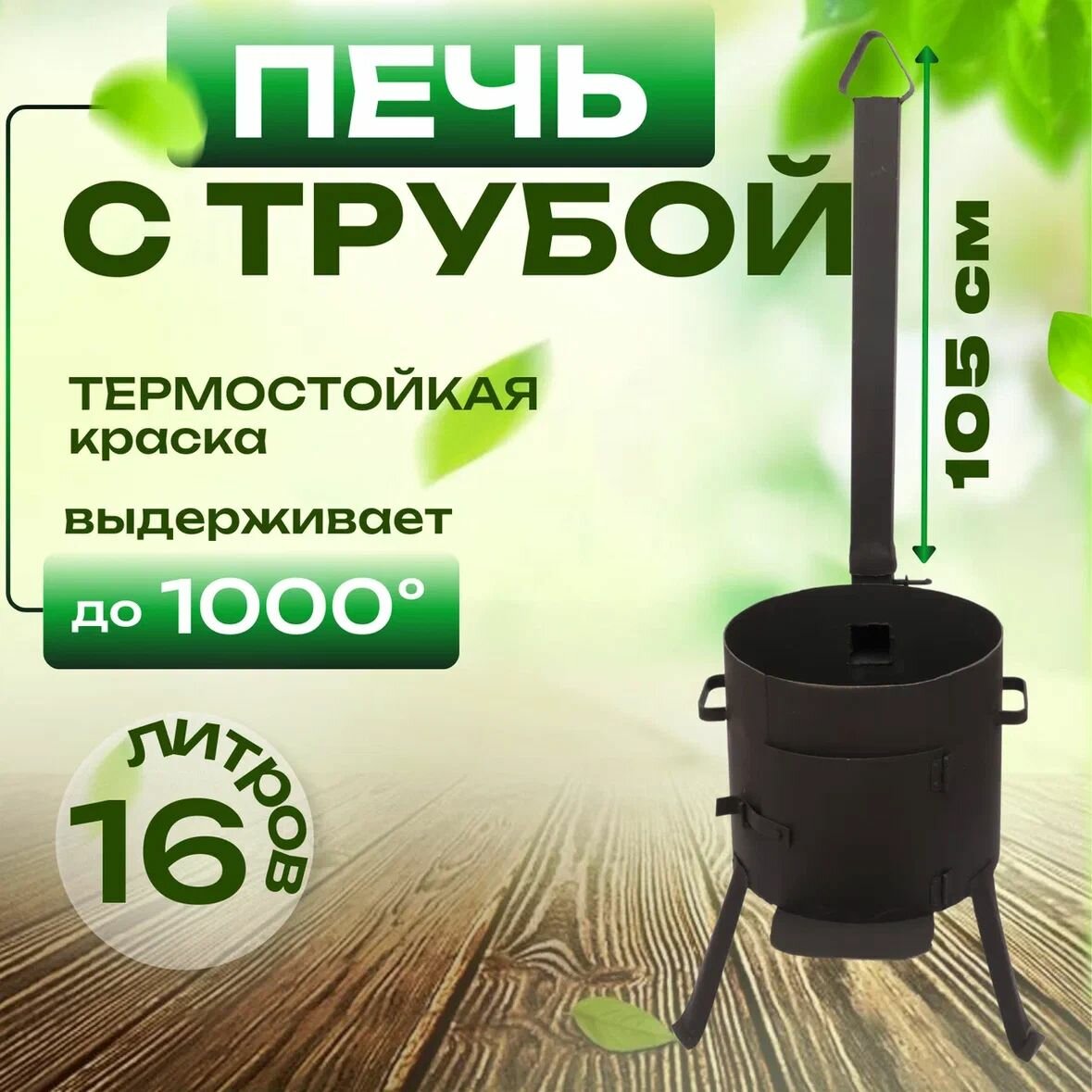 печь с трубой. Отличное решение для похода на дачу, пикник и загородный дом. Если решили отдохнуть на природе, будь то один или с друзьями, вам просто необходим хороший казан с очагом, для приготовления вкусной пищи. В комплекте идет печка с трубой и дверцей16 л В трубу уходит весь дым, поэтому в еду не попадает сажа. Дверце помогает сохранить тепло, благодаря чему очаг быстрее прогревается. Ну а после использования его можно разобрать для более удобного хранения. Покупка печь самое оптимальное решение на данный момент. Вы не только сможете с комфортом готовить еду, но и получите подарок.