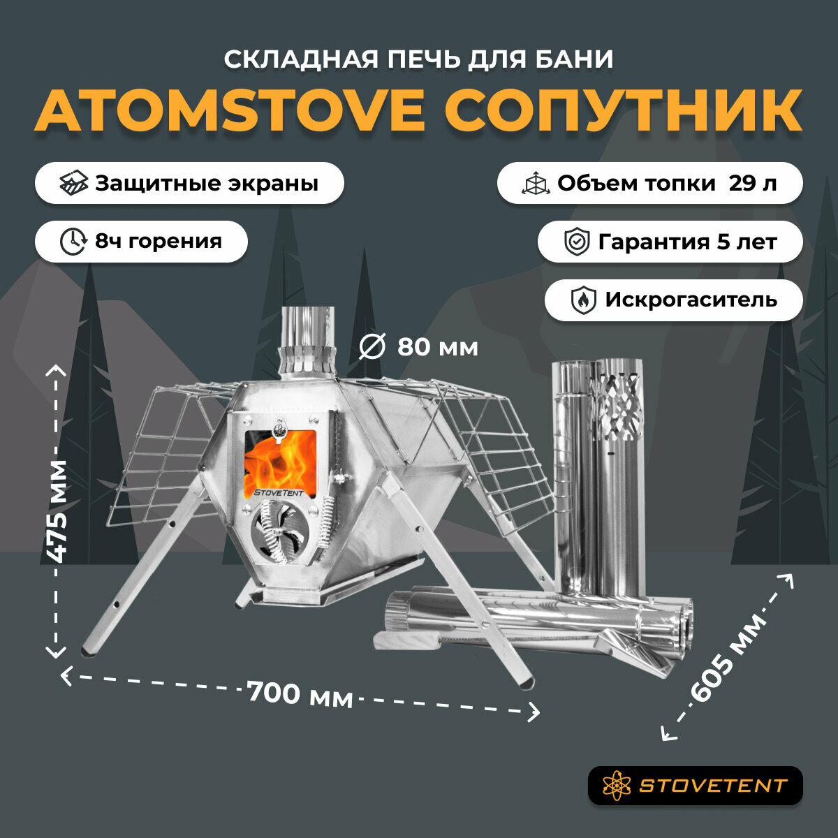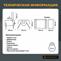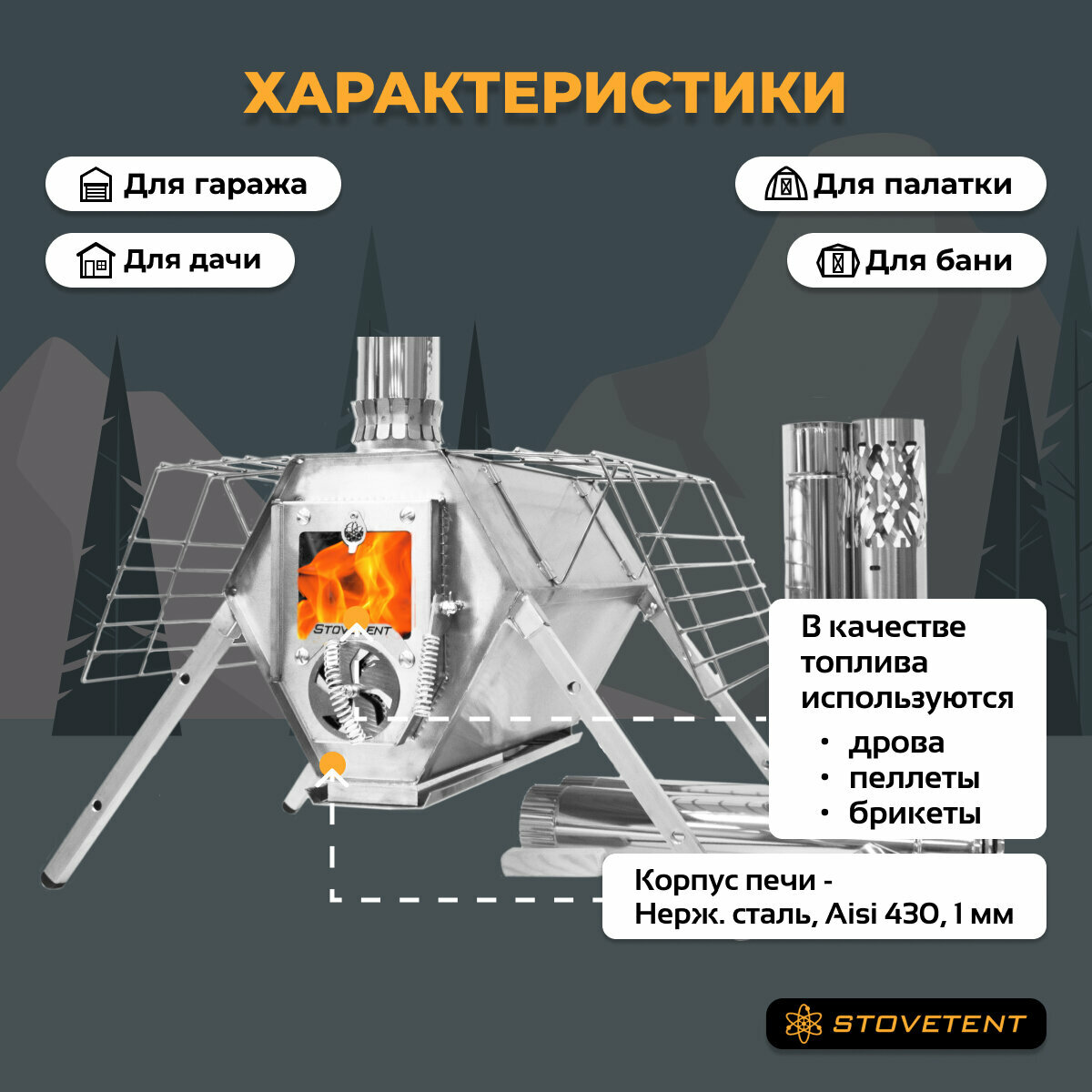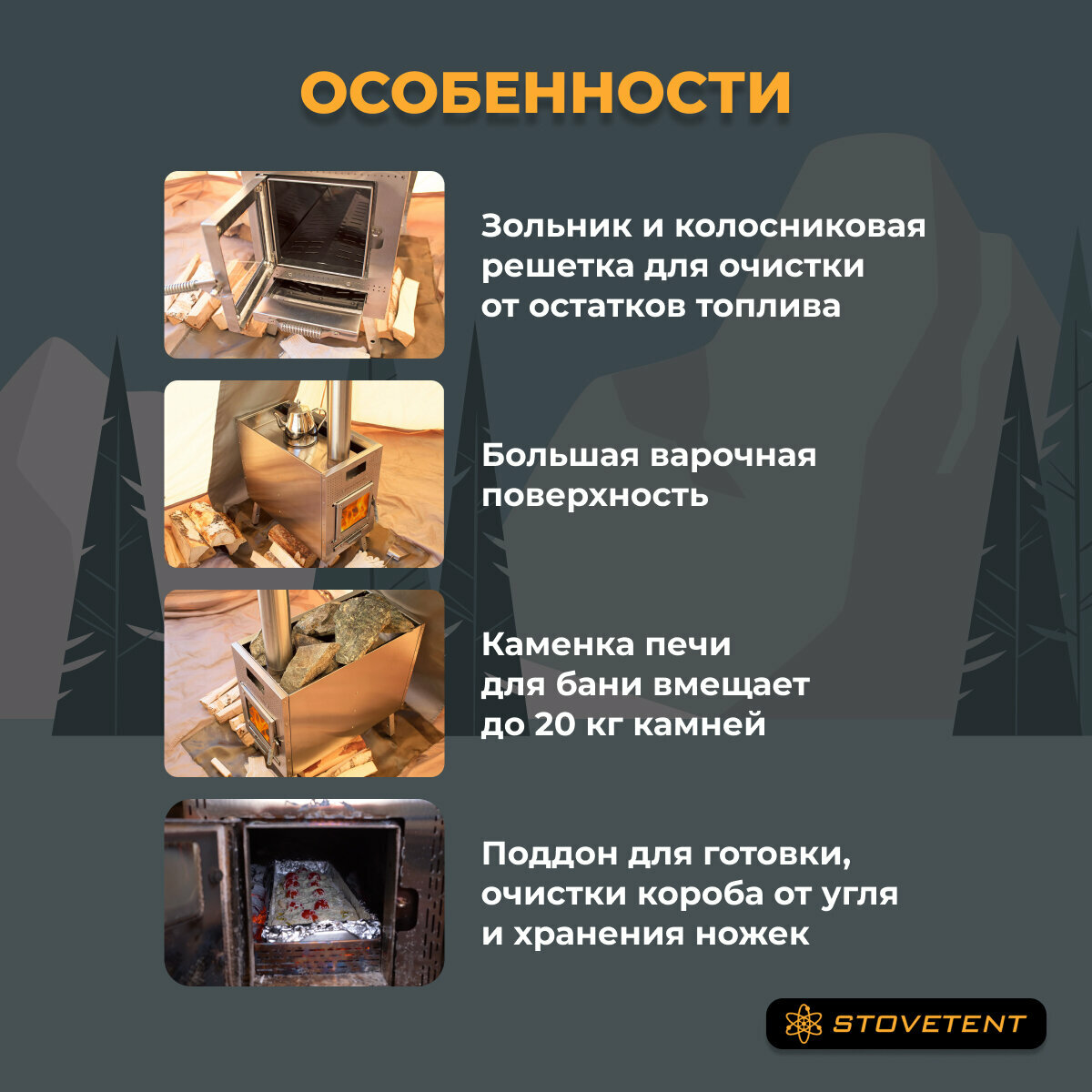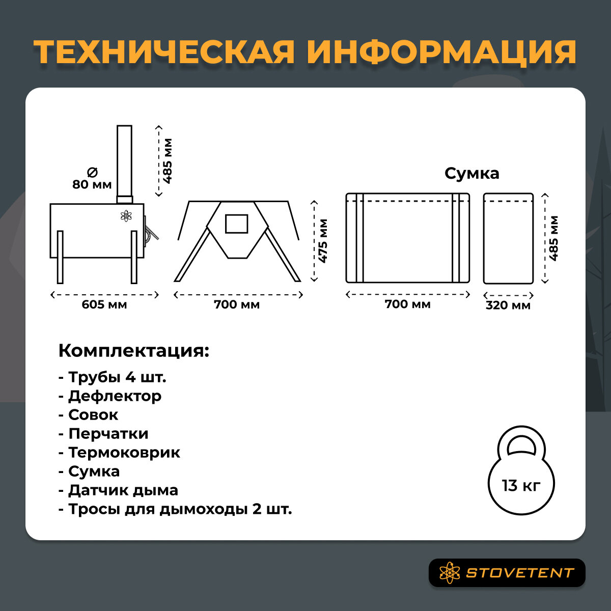 Печь на дровах в палатку Сопутник комплектуется трубами дымохода, дефлектором, съемными ножками с отдельным чехлом, перчатками, термоковриком, дымовым извещателем, совком и усиленной сумкой-чехлом для транспортировки.