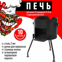 Печь под казан 10 литров. Окрашена термостойкой краской. Печь необходима для крепления казана при приготовлении пищи на открытом воздухе. Дым у данной печи выходит через треугольные отверстия по месту крепления казана. Плюсы в использовании печи:1. Казан крепко стоит, случайно не упадет.2. Казан равномерно нагревается по всей поверхности, что способствует скорейшему приготовлению пищи.3. Снижается возможность пригорания пищи на отдельных участках казана, т. к нагрев распределяется равномерно по всей поверхности.4. Благодаря габаритам печи, не нужно нагибаться что бы мешать пищу в казане.5. Печь разборная, что позволяет ее взять с собой на природу, на дачу, в путешествие. Характеристики