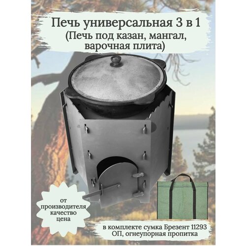 Универсальная печь 3 в 1 - может быть использована как печь для казана, мангал и варочная плита (под чайник, кастрюлю, сковороду и др.). Конструкция разборная, складная. Износостойкая сумка из брезента для переноски и хранения. Отличительная особенность от подобных печей других производителей - наличие съёмной дверцы. Материал печи сталь Ст3 3 мм. Вес 20 кг. Не займёт много места в автомобиле. На фото представлен казан на 8 литров.