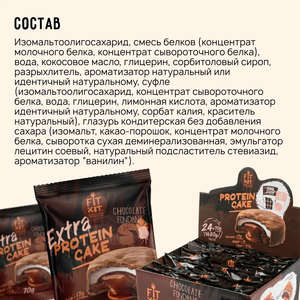 Купить Протеиновое печенье FIT KIT Extra Protein Cake, 24х70 г, шоколадный фондан с доставкой по всей России. Протеиновое печенье FIT KIT Extra Protein Cake, 24х70 г, шоколадный фондан: сравнение цен, характеристики, фото, актуальное наличие и цены.