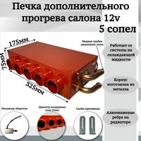 Дополнительная печка предназначена для обогрева салона автомобиля в суровых погодных условиях. Состоит из жидкостного радиатора, диффузора и двух электрических вентиляторов, питающихся от электрической сети автомобиля. Монтируется в салон автомобиля при недостаточном выделении тепла штатным отопителем. Широко используется для отопления салонов автобусов, будок вездеходов и прочей спецтехники. Присоединяется к малому кругу охлаждения двигателя и обеспечивает дополнительное тепло в местах салона, где было холодно. Отопитель не электрический, его принцип работы аналогичен штатной автомобильной печке. В конструкции имеется радиатор, через который прогоняется охлаждающая жидкость, нагретая двигателем, и электровентилятор. Характеристики: Размеры корпуса с учетом медных трубок: 325*175*75мм. Патрубки d=16мм. Диаметр воздушных сопл 35мм Напряжение питания 12V Корпус изготовлен из металла.