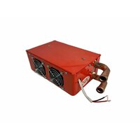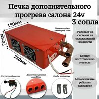 Дополнительная печка предназначена для обогрева салона автомобиля в суровых погодных условиях. Состоит из жидкостного радиатора, диффузора и двух электрических вентиляторов, питающихся от электрической сети автомобиля. Монтируется в салон автомобиля при недостаточном выделении тепла штатным отопителем. Широко используется для отопления салонов автобусов, будок вездеходов и прочей спецтехники. Присоединяется к малому кругу охлаждения двигателя и обеспечивает дополнительное тепло в местах салона, где было холодно. Отопитель не электрический, его принцип работы аналогичен штатной автомобильной печке. В конструкции имеется радиатор, через который прогоняется охлаждающая жидкость, нагретая двигателем, и электровентилятор. Характеристики: Размеры корпуса с учетом медных трубок: 250*150*70мм. Патрубки d=16мм. Диаметр воздушных сопл 35мм Напряжение питания 24V Корпус изготовлен из металла.