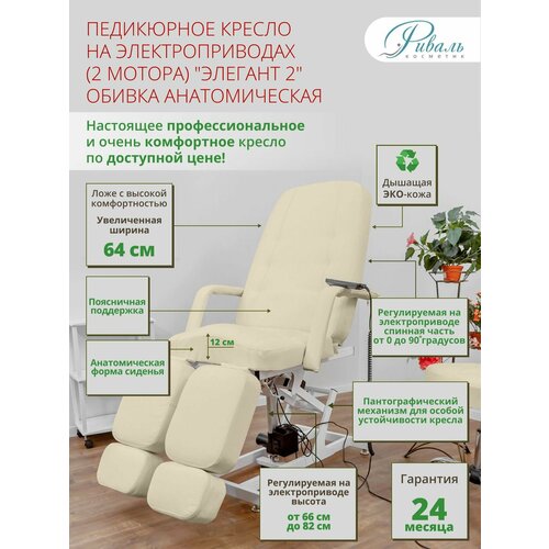 • Электрическое педикюрное кресло кушетка Элегант-2 с обивкой Анатомическая, необходимое оборудование для мастера аппаратного педикюра и является основным оснащением салонов красоты, парикмахерских и педикюрных кабинетов. • Кресло для педикюра Элегант-2 с регулировкой высоты и наклона спины на электроприводе. • Для сохранения большей устойчивости, верхняя платформа установлена на специальном пантографическом механизме, с помощью которого, осуществляется подъем и опускание на высоту 17 см. • Кресло имеет очень удобную, большую (длиной 185 см), широкую (64 см), и толстую от 9 до 12 см, обивку, с специальными анатомическими возвышенностями на сидении (в паховой зоне и ягодиц) и на спинной части в поясничной зоне. • Обивка оборудована съемными подлокотниками, и удлиняющимися пяточными частями, имеет прочный и устойчивый каркас. • Подъем и фиксация ножных частей производится надежным механическим способом. • Быстрая и простая сборка по инструкции. • Рассчитано на нагрузку до 220 кг. • Гарантия 24 мес. • Удлиняющиеся пяточные элементы, позволяют не использовать подставку для педикюра и создают дополнительное удобство для клиента. • Для того что бы обивка дольше сохраняла хороший внешний вид, его можно защитить специальным многоразовым чехлом для педикюрного кресла. • Высокий уровень подъема ножной части позволяют мастеру комфортно наносить гель с мочевиной и др препараты для работы с пятками или осуществлять лечение грибка и подологический педикюр. • Для поверхностей нашего кресла применяется качественная «дышащая» экокожа производства Турции, специально разработанная для интенсивного использования. • Наше педикюрное кресло может быть разложено в качестве кушетки и может применяться для педикюра, для подологии, нанесения тату, для массажа, так и для косметологии. А так же успешно применено как косметологическое кресло, для работы визажистов, эстетистов с бровями и по наращиванию ресниц. • Широкая и удлиненная спинная часть предоставляет дополнительные удобства мастеру, для выполнения макияжа (мейкап) лица, визажа и других манипуляций с шеей и лицом клиента. • Анатомическая обивка — это обивка, которая повторяет изгибы тела человека. Толщина может варьироваться от 9 до 12 см. Спинка и сидение с возвышениями в области поясницы и паха. Это нужно для того, чтобы человек при нахождении на кресле «не скатывался», а также для поддержки его поясницы. Поэтому клиент сможет находиться в кресле долгое время. Нижняя часть с механизмом удлинения и фиксации. Покрытие обивки матовое, поэтому она не скользит. Выполнено из дышащей экокожи (производство – Турция, 50 000 циклов, 100% PU полиуретан). Покрытие имеет приятную на ощупь фактуру.