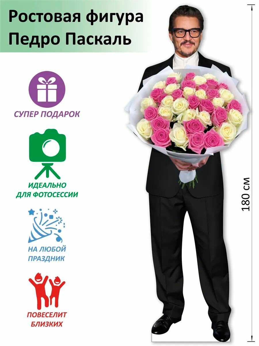 Ростовая фигура Педро Паскаля 10 – это уникальное украшение для организации праздников. Она станет отличным дополнением к любому торжеству, будь то День святого Валентина, 8 Марта или день рождения.