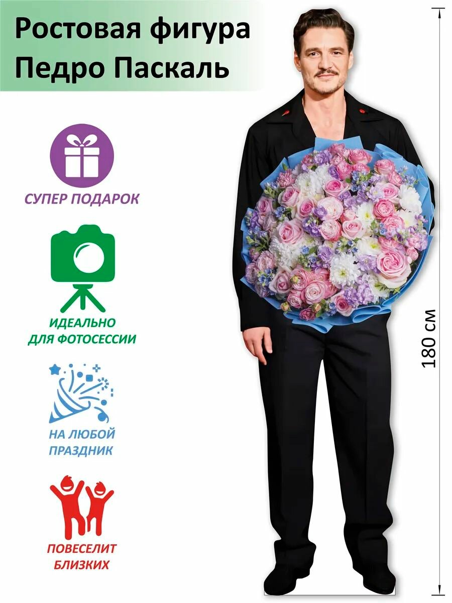 Ростовая фигура Педро Паскаля - это уникальное украшение для организации праздников, которое станет отличным дополнением к любому торжеству. Фигура выполнена в полный рост и имеет высоту 180 см, что позволяет создать неповторимую атмосферу праздника.