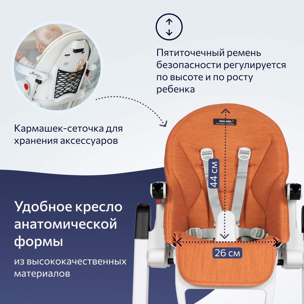 Компактный и многофункциональный стульчик, который растет вместе с малышом. Первые месяцы его удобно использовать для отдыха, начиная с шести месяцев для еды и игр. Стульчик Siesta можно использовать без столика, чтобы ребенок мог сидеть за столом со взрослыми. Практичный и простой в уходе. Обивка сиденья изготовлена из инновационного водоотталкивающего материала, на котором не остаются пятна. Ребенок испачкал сиденье детским питанием? Не беда! Просто протрите поверхность салфеткой, а съемный столик можно поместить в посудомоечную машину. Несмотря на то, что материал не промокает, он так же еще и очень комфортный и мягкий. Дышащая гипоаллергенная поверхность позволяет спинке не потеть и подходит даже для самых чувствительных малышей с первых дней жизни. Одобрен для детей с рождения и до трех лет.