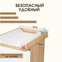 Универсальная пеленальная доска Mr Sandman для комода – это универсальное приспособление, которое было разработано специально для использования её на поверхности комодов. Накладная пеленальная рамка фиксируется на комоде сверху и может регулироваться в зависимости от глубины комода, а также позволяет разместить необходимые принадлежности для ухода за малышом в максимально доступном для Вас месте. Съемная пеленальная доска на комод создаст удобную и безопасную пеленальную поверхность на комоде с глубиной столешницы от 44 см до 52 см. Доска для пеленания на комод предназначена для обеспечения максимальной безопасности и комфорта, при пеленании малыша. Рамка для пеленания на комод изготавливается из ЛДСП. Внутренние габариты пеленального столика (ШхВ) - 56х8см. Накладка на комод цвета дуб идеально подойдет на комоды натурального цвета.