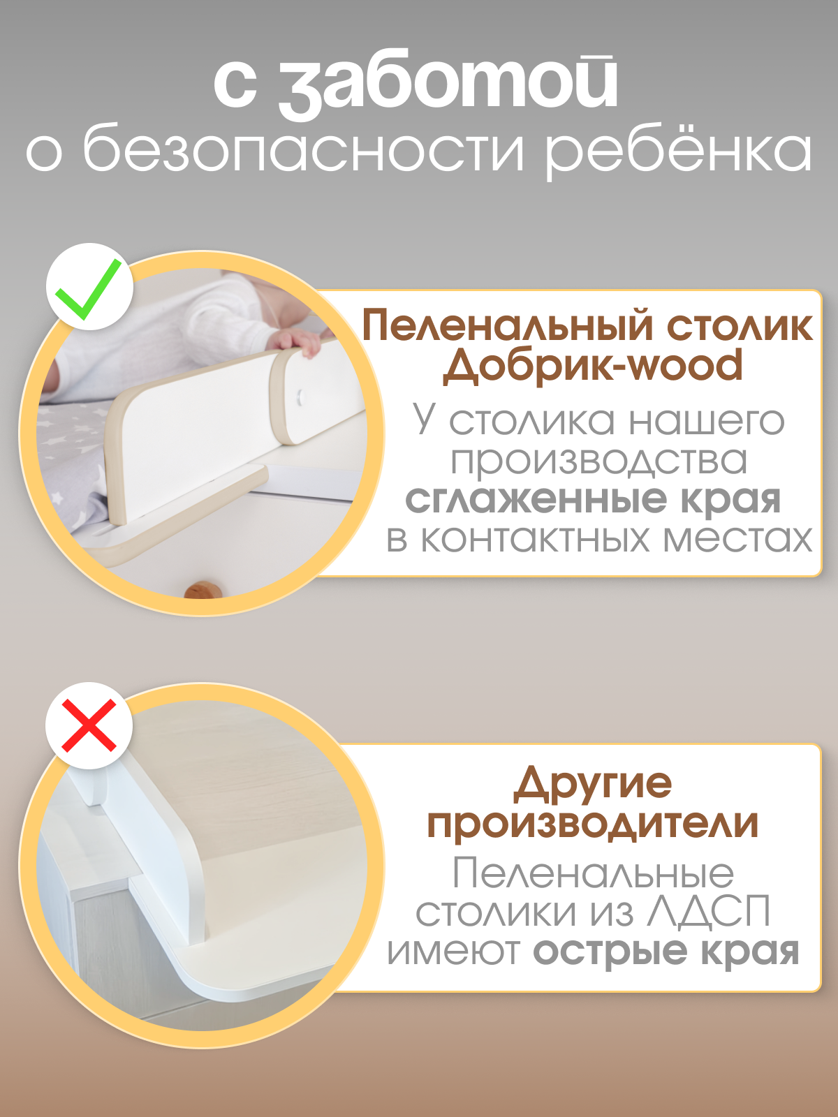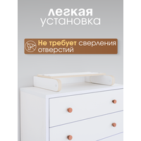 Съемный пеленальный столик на комод - удобное и практичное решение для заботливых родителей. С помощью пеленальной доски вы сможете легко и за считанные минуты организовать безопасное место для ухода за новорождённым ребёнком. Съёмная пеленальная доска временно превратит ваш обычный комод в пеленальный, не испортив его внешний вид. Нашим главным преимуществом является то, что наша пеленальная доска - одновременно складная и съемная. Пеленальная доска изготовлена из высококачественного материала - МДФ толщиной 16 мм. Простая уcтановка, надёжно фиксируется на комоде без сверления отверстий и крепежей. При необходимости столик можно дополнительно закрепить саморезами к задней стенке комода, для этого предусмотрены 2 отверстия на задней стенке столика. Специальный паз-регулировка позволяет настроить размер пеленального столика под ваш комод. Положение столика можно поменять вправо-влево, не снимая с самого комода. Пеленальный столик можно собрать одной рукой и получить доступ к верхнему ящику комода. Конструкция пеленальной доски позволяет расположить комод плотно к стене, благодаря чему увеличивается полезное пространство помещения. При разработке пеленального столика мы позаботились о безопасности малышей и сгладили края в контактных местах. Благодаря тщательной шлифовке все поверхности пеленального столика гладкие наощупь. Съёмный пеленальный столик представлен в 4 размерах. Выберите свой размер пеленального столика из предложенных нами вариантов. Пеленальная доска в размере L подойдёт для комодов глубиной 52-58 см. Ширина пеленального столика - 60 см. Размер выступающей части - 23 см.