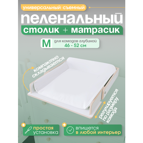 Съемный пеленальный столик на комод в комплекте с матрасиком - удобное и практичное решение для заботливых родителей. Пеленальная доска изготовлена из высококачественного материала - МДФ толщиной 16 мм. Простая уcтановка, надёжно фиксируется на комоде без сверления отверстий и крепежей. При необходимости столик можно дополнительно закрепить саморезами к задней стенке комода, для этого предусмотрены 2 отверстия на задней стенке столика. Специальный паз-регулировка столика позволяет настроить размер пеленального столика под ваш комод. Положение столика можно поменять вправо-влево, не снимая с самого комода. Матрасик на пеленальный столик изготовлен из высококачественной водонепроницаемой ткани DUSPO, которая гарантирует защиту от намокания и позволяет легко поддерживать матрас в чистоте. Внутренний наполнитель детского матраса – это мягкий и гипоаллергенный синтепон, который обеспечивает комфорт и безопасность для нежной кожи вашего ребенка. Пеленальный столик можно собрать одной рукой и получить доступ к верхнему ящику комода. Конструкция пеленальной доски позволяет расположить комод плотно к стене, благодаря чему увеличивается полезное пространство помещения. При разработке пеленального столика мы позаботились о безопасности малышей и сгладили края в контактных местах. Благодаря тщательной шлифовке все поверхности пеленального столика гладкие наощупь. Съёмный пеленальный столик представлен в 4 размерах. Выберите свой размер пеленального столика из предложенных нами вариантов. Пеленальная доска в размере M подойдёт для комодов глубиной 46-52 см. Ширина пеленального столика - 60 см. Размер выступающей части - 23 см.
