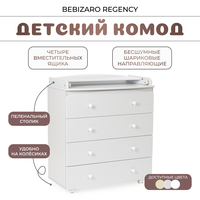 Комод BEBIZARO REGENCY FOUR GRAYДетский комод BEBIZARO REGENCY «FOUR» (4 ящика) - Каждый родитель знает, при рождении ребёнка на сколько важно иметь под рукой детские вещи и принадлежности. В таком случае их незаменимый помощник становится детский комод BEBIZARO. Комод BEBIZARO можно разместить в любом удобном месте так как имеет 4-е поворотных колеса со стопором. Это незаменимый предмет в доме, выступающий не только в роли шкафа для детских вещей, но и как пеленальный столик и место для переодевания ребёнка. Удобный и практичный комод с 4-я ящиками позволит значительно сэкономить пространство и разместить все необходимое для вашего ребёнка, детские вещи, подгузники, средство для гигиены. Комод оборудован пеленальным столиком с простым и надежным механизмом раскладывания, 4-е вместительных ящика и 4-е колёса со стопором. Особенности: каркас комода выполнен из ЛДСП; верх комода выполнен из Массива берёзы и МДФ; ящики комода выполнены из ЛДСП и МДФ; направляющие шариковые; комод имеет откидной пеленальный столик; комод имеет четыре удобный и практичный ящик для хранения белья; комод имеет четыре поворотных колёса, для перемещения комода в комнате, для установки в неподвижном положении на двух из них имеются стопоры; Характеристики: Материал: массив берёзы, ЛДСП, мдфящик для хранения белья: (ДхШхВ) 73х35х10 смКоличество колёс: 4Колёса: Пластмассовые, РезинаГарантийный срок: 12 месяцевГабариты комода: (ДхШхВ) 84х44х97 смГабариты упаковки: (ДхШхВ) 90х50х22 смВес упаковки: 47 кгСтрана-изготовитель: Россия