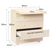 Комод BEBIZARO REGENCY FOUR VANILLAДетский комод BEBIZARO REGENCY «FOUR» (4 ящика) - Каждый родитель знает, при рождении ребёнка на сколько важно иметь под рукой детские вещи и принадлежности. В таком случае их незаменимый помощник становится детский комод BEBIZARO. Комод BEBIZARO можно разместить в любом удобном месте так как имеет 4-е поворотных колеса со стопором. Это незаменимый предмет в доме, выступающий не только в роли шкафа для детских вещей, но и как пеленальный столик и место для переодевания ребёнка. Удобный и практичный комод с 4-я ящиками позволит значительно сэкономить пространство и разместить все необходимое для вашего ребёнка, детские вещи, подгузники, средство для гигиены. Комод оборудован пеленальным столиком с простым и надежным механизмом раскладывания, 4-е вместительных ящика и 4-е колёса со стопором. Особенности: каркас комода выполнен из ЛДСП; верх комода выполнен из Массива берёзы и МДФ; ящики комода выполнены из ЛДСП и МДФ; направляющие шариковые; комод имеет откидной пеленальный столик; комод имеет четыре удобный и практичный ящик для хранения белья; комод имеет четыре поворотных колёса, для перемещения комода в комнате, для установки в неподвижном положении на двух из них имеются стопоры; Характеристики: Материал: массив берёзы, ЛДСП, мдфящик для хранения белья: (ДхШхВ) 73х35х10 смКоличество колёс: 4Колёса: Пластмассовые, РезинаГарантийный срок: 12 месяцевГабариты комода: (ДхШхВ) 84х44х97 смГабариты упаковки: (ДхШхВ) 90х50х22 смВес упаковки: 47 кгСтрана-изготовитель: Россия