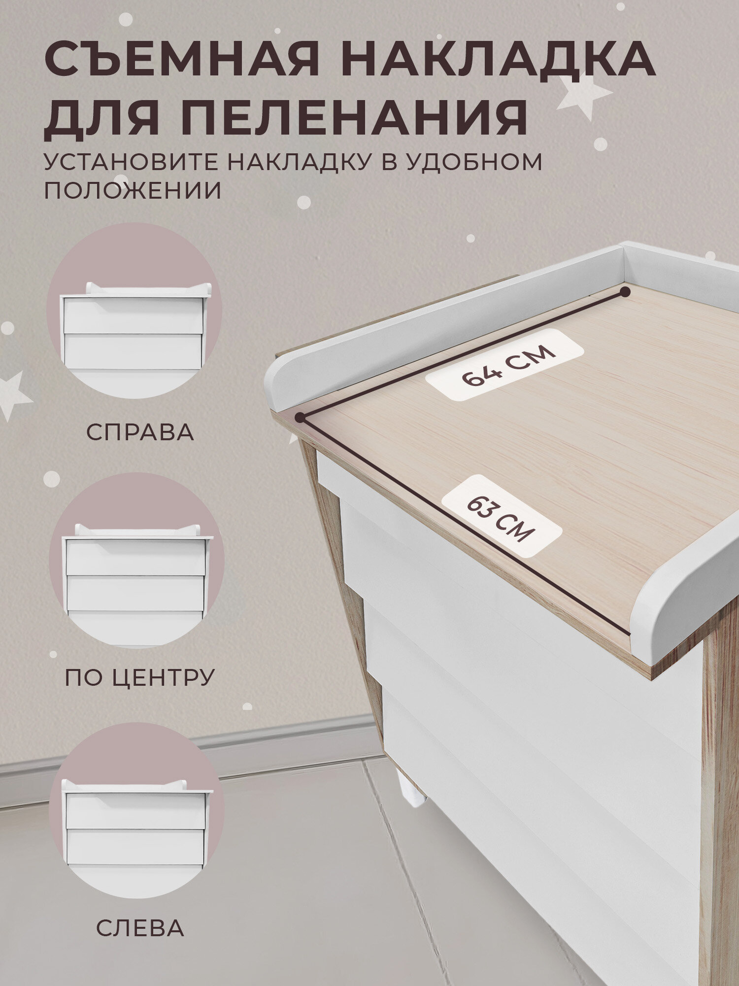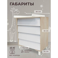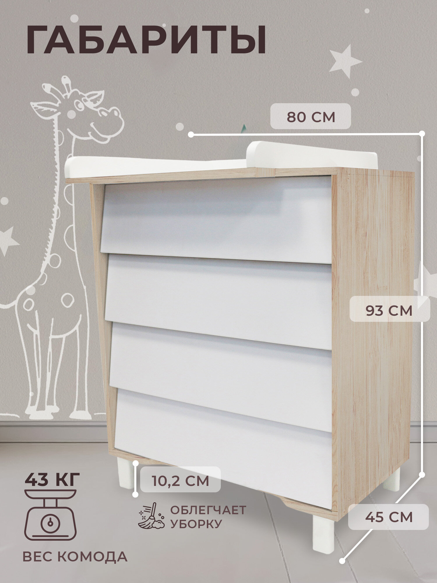 Sweet Baby Пеленальный комод Dante Стильный пеленальный комод Sweet Baby Dante станет отличным помощником для родителей в уходе за малышом. Комод выполнен в скандинавском стиле и отлично впишется в любой интерьер. Особенности: комод для пеленания Sweet Baby Dante выполнен из качественных материалов. стильные наклонные фасады не только украсят интерьер комнаты, но и удобны в использовании 4 вместительных ящика на шариковых направляющих способны выдержать большую нагрузку бортик для пеленания – съемный, благодаря чему вы сможете использовать комод, как классический, когда ваш ребенок подрастет бортик/пеленатор реверсивный: можно установить как по краям, так и по центру- разместите его так, как вам удобно Подробности: Внешние габариты (ДхШхВ) : 45х80х93 см Материалы: ЛДСП, ДВП, береза, кромкооблицовочный материал ПВХ, мебельная фурнитура Размер пеленальной площади: 630х640 мм Вес с упаковкой: 45 кг Вес без упаковки: 43 кг