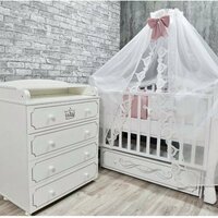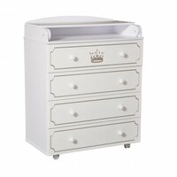 Пеленальный комод Malika Queen отличается привлекательным дизайном.Фасады отделаны фрезеровкой и раскрашены под патину что придаёт комоду элегантный вид.В конструкции изделия предусмотрены 4 маленьких передвижных колеса, несколько вместительных ящичков на шариковых направляющих и откидывающаяся пеленальная столешница.Детский комод вмещает в себя постельные принадлежности, средства гигиены, распашонки, подгузники, игрушки, ползунки и другие личные вещи ребенка.Гладкая столешница идеально подходит для пеленания ребенка, а колесики позволяют быстро перемещать комод.