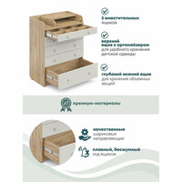 Комод очень вместительный благодаря пяти ящикам, которые установлены на надежные шариковые направляющие бесшумного хода. Нижний ящик большей глубины, а верхний с органайзером для удобства сортировки детских вещей (6 отделений). Глубина ящиков сверху вниз: 8,5 см, 10 см, 10 см, 10 см, 18,7 см.