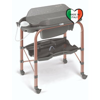 - Столик имеет складную конструкцию с откидывающейся пеленальной доской, оборудован небольшой и удобной в использовании анатомической ванночкой предназначенной для малышей до 12 месяцев с полкой-держателем для ванных принадлежностей.