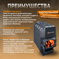 Увеличенная отдача тепла благодаря конвекторам и конвекционным трубам, которые обеспечивают движение нагретого воздуха. Компактные габариты позволяют установить печь в любом удобном месте. Высокая эффективность достигается благодаря особой конструкции топки с внутренними конвекционными трубками, которые нагреваются до высоких температур во время горения, повышая КПД печи и скорость нагрева помещения. Надежность обеспечивается двойным покрытием наружных поверхностей печи жаростойкой кремнийорганической эмалью. Топочная дверца выполнена из чугуна, обеспечивая герметичность. Универсальность обеспечивается широкой нагревающей поверхностью верхней части корпуса, позволяющей размещать несколько посудин одновременно для разогрева пищи. Дизайн печи включает каминный экран на топочной дверце, что позволяет наблюдать пламя внутри печи. Технологичность обеспечивается наличием дожигательного канала (2 жиклера) на задней стенке топки, который подает необходимое количество кислорода для вторичного дожига. Кожух-конвектор на боковых стенках печи увеличивает эффективное отведение тепла с боковых стенок, снижает инфракрасное излучение и значительно снижает температуру внешней облицовки.
