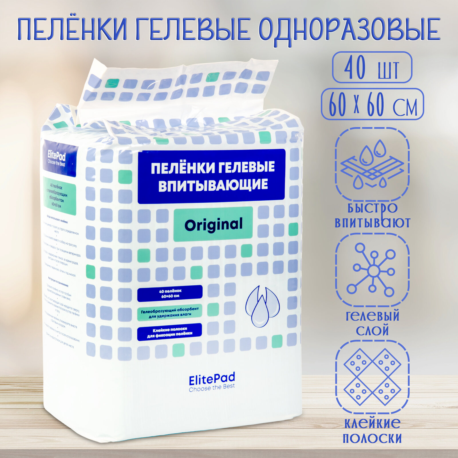 ELITEPAD Пелёнки одноразовые, гелевые «Original», 60х60см, 40 шт/уп: сравнение цен, характеристики, фото, актуальное наличие и цены.