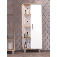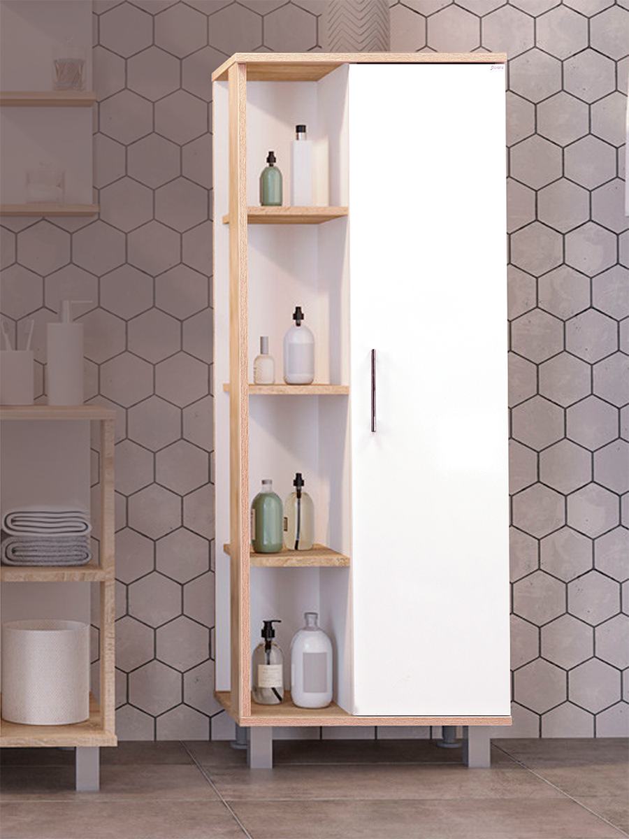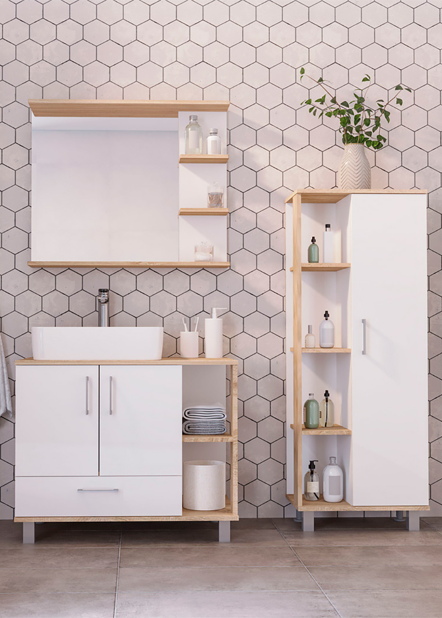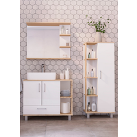 Это особая атмосфера в ванной комнате. Фактура поверхности полочек с имитацией натурального дерева цвета дуб Сонома в сочетании с белым глянцевым покрытием фасадов создают легкий и экологичный дизайн, который украсит Вашу ванную комнату.