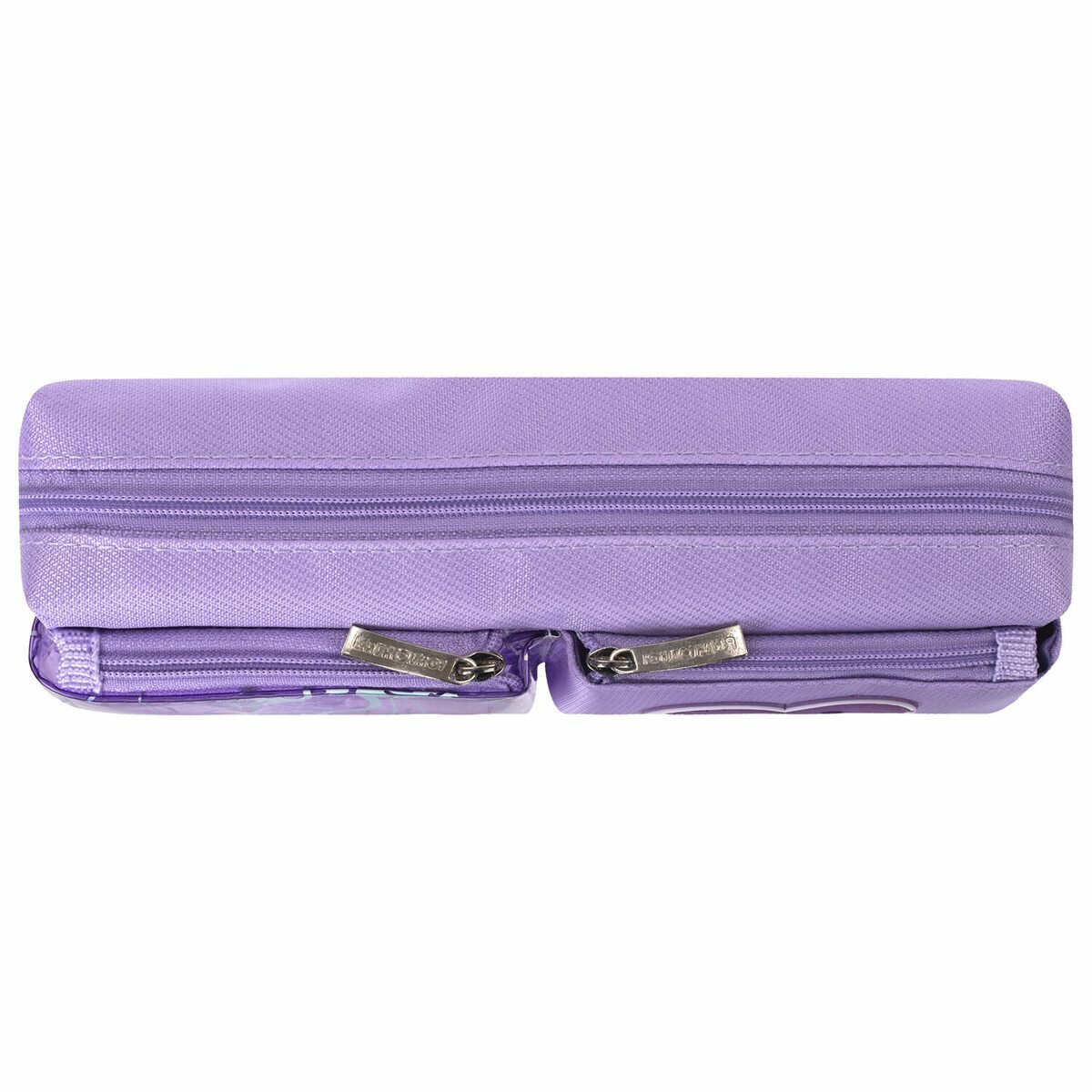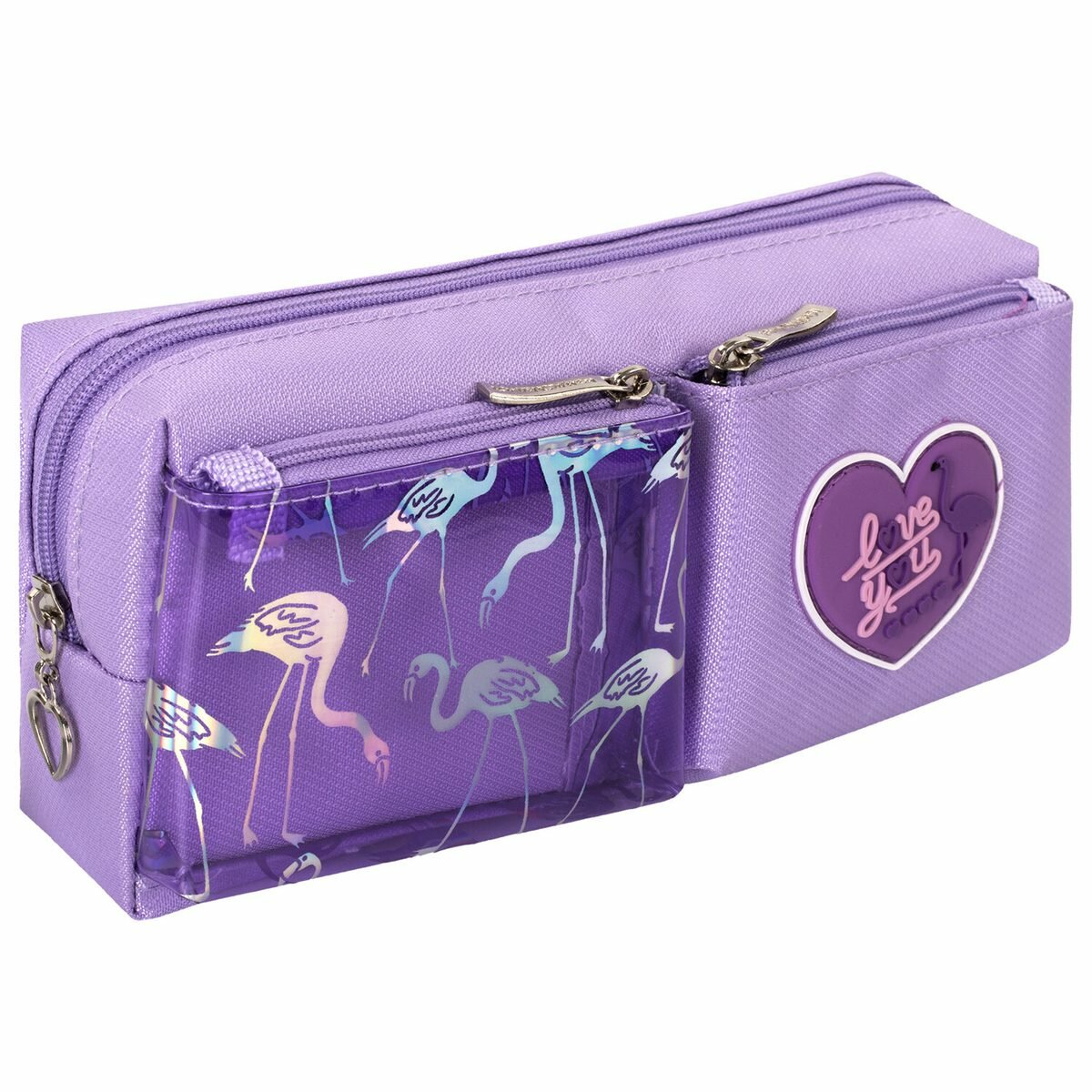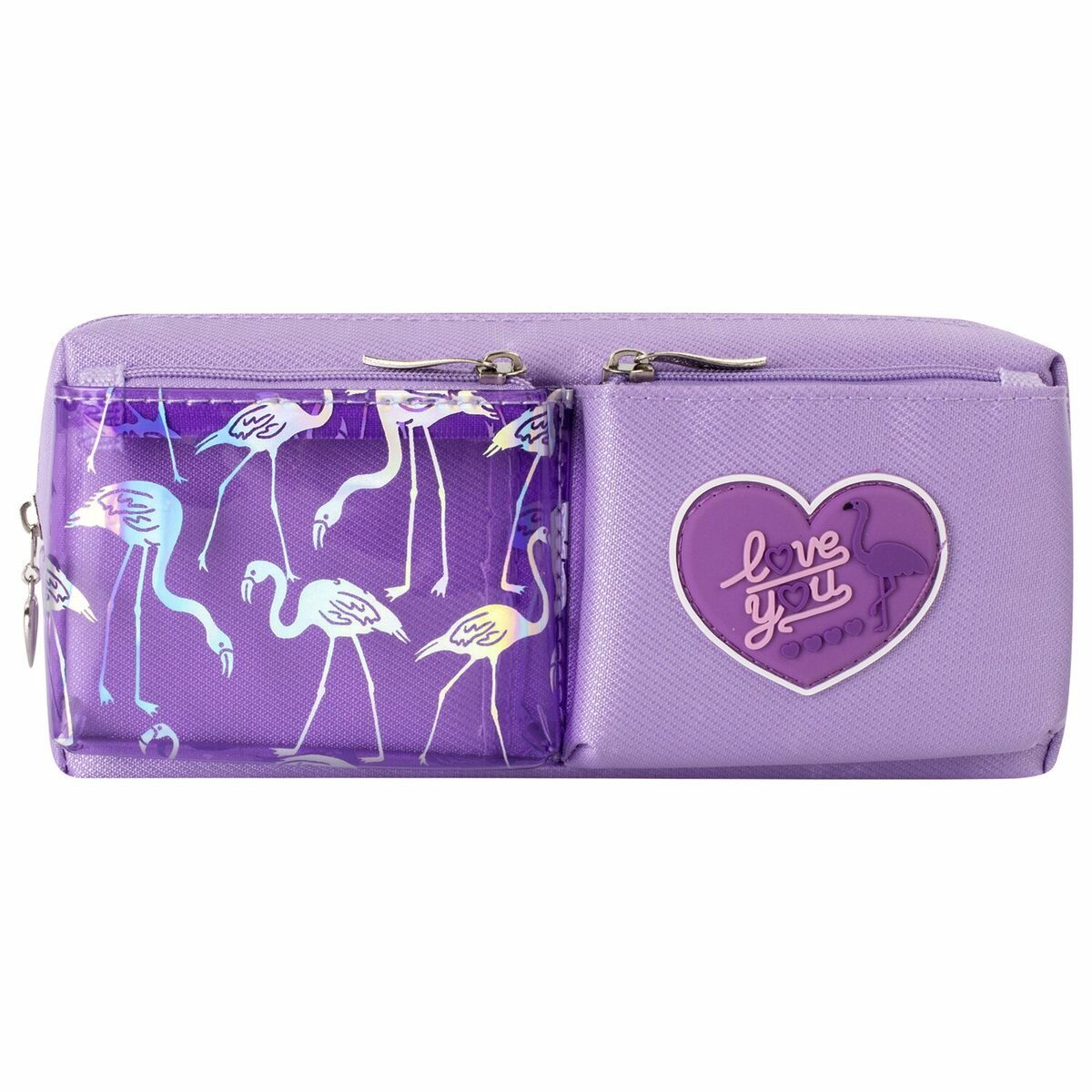 Пенал-косметичка имеет привлекательный фиолетовый цвет и принт в виде фламинго, что делает его ярким и модным аксессуаром. Застежка-молния с металлическим бегунком обеспечивает безопасное хранение содержимого.
