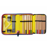 Набор состоит из самых необходимых предметов для школьника: - 10 тонких цветных карандаша, - 4 больших цветных карандаша, - 2 чернографитовых карандаша, - 2 линейки, - ластик, - точилка.