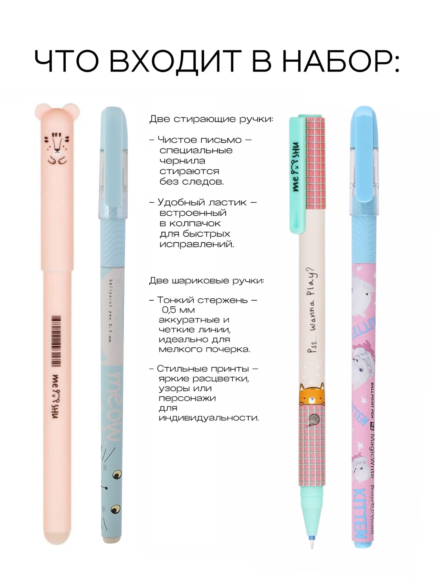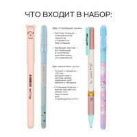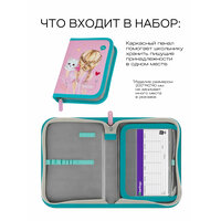 Наполнение пенала включает в себя 26 предметов, включая 12 цветных пластиковых карандашей, 2 шариковые ручки синего и зеленого цвета, 3 чернографитных карандаша, 2 ручки со стираемыми чернилами, линейку, ластик и точилку.