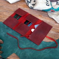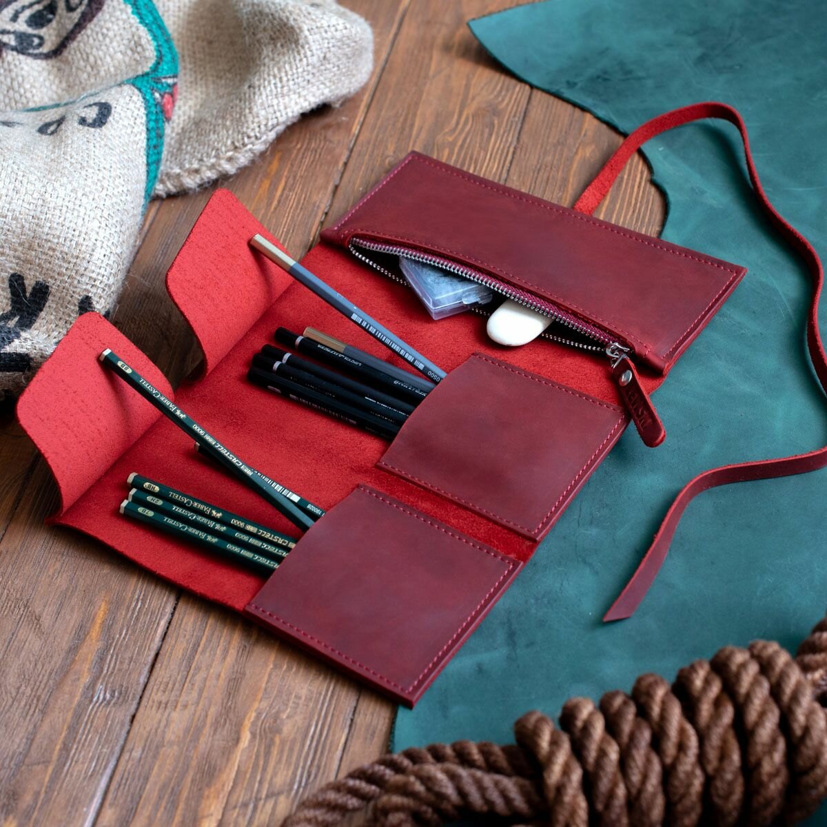 Купить Пенал — скрутка из натуральной кожи для карандашей и ручек. Красный. Натуральная кожа с доставкой по всей России.
