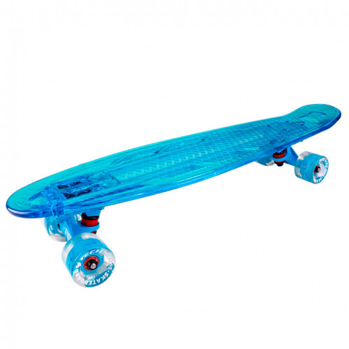 Эта яркая модель не только отличается тем, что сочетает в себе прочность и прозрачный материал, но также и наличием подсветки. Led-лампочки установлены как в саму деку, так и в колеса. Только представьте, как круто рассекать улицы на таком скейте — особенно в вечернее время. Колеса оборудованы скоростными подшипниками ABEC 7, которые придают хороший накат. Пластиковый скейтборд весьма легок из-за своих небольших габаритов, размер деки 27 дюймов. Отличный вариант для городских прогулок, который будет вызывать восхищение у прохожих и доставлять Вам истинный комфорт и безопасность. Данная модель представлена в 4-х цветах Все модели оборудованы LED подсветкой как на деке, так и на колесах Доска выполнена из ударопрочного прозрачного поликарбоната Концевой загиб (Single Kick) Достаточно мягкие колеса 60х45 мм, жесткостью 78А, для лучшего сцепления с дорогой и устойчивости Алюминиевая усиленная платформа и подвеска 3.25" Амортизаторы жесткостью 85А Рифленая верхняя часть Батарея 420 mah, литиевая, для заряда рекомендуется использовать универсальное зарядное устройство 5V-1А