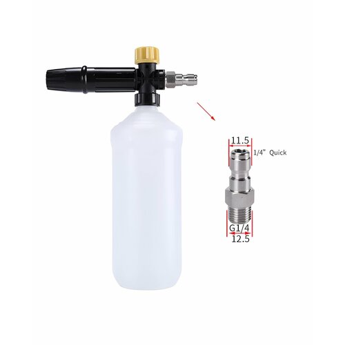 Пеногенератор на Huter регулируемый профессиональный для бытовых и профессиональных моек высокого давления. Изготовлен из высокопрочного полипропилена объемом 1 литр, используется для нанесения пены на очищаемую поверхность. У модели есть несколько регулировок ширины распыления и давления на выходе. По уровню пенообразования сопоставим с профессиональными аппаратами на автомойках. Установлена пенная таблетка для создания густой пены. Оснащен быстросъемом для моек, как на фото. Пеногенератор профессиональный для моек Huter линеек 135, 165, 195, 210, Ресанта 140, 170, 200, 220 (кроме ARV), BORT PRO и другие модели оснащенные быстросъемным соединением как на фото.