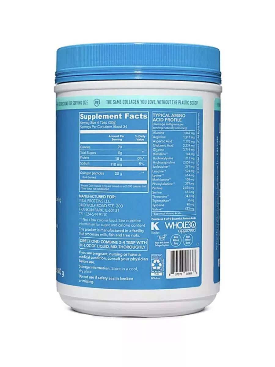 Внимание! Пептиды коллагена без мерной ложки, о чем сказано на упаковке! Пептиды Коллагена с Гиалуроновой Кислотой от Vital Proteins - это высококачественный продукт премиум-класса, содержащий 20 г коллагеновых пептидов на порцию. В состав также входят два дополнительных функциональных ингредиента - 100% дневной нормы витамина С и 80 мг гиалуроновой кислоты.