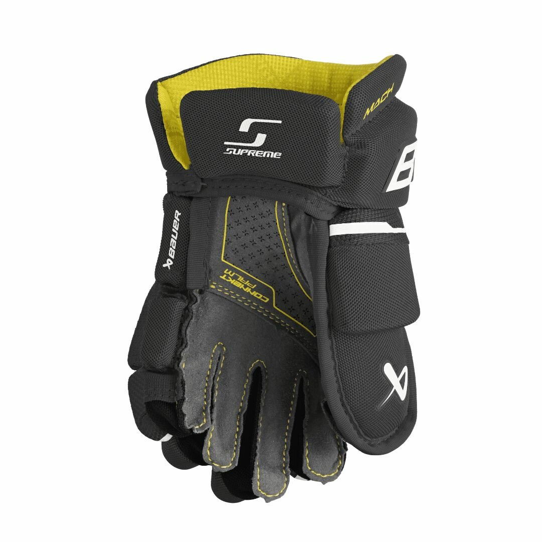 Перчатки MACH предназначены для игроков профессионального уровня, которые хотят получить более плотную посадку с повышенной чувствительностью. Перчатка SUPREME MACH оснащена технологией SHOOTBOOST FINGER - трехсоставные средний и безымянный пальцы, а также аналогичный трехсоставной большой палец, оптимизирующий положение руки на клюшке при броске. Модель также имеет гибкую манжету AMP с использованием материала CURVE COMPOSITE, охватывающую запястье во всех положениях. С точки зрения защиты в новых перчатках были улучшены показатели боковой жесткости и поглощения удара по сравнению с моделью ULTRASONIC, благодаря использованию трехслойной пены. Верхний слой EPP обеспечивает легкость и жесткость, а пена DC TECH поглощает энергию от ударов клюшкой. Слой пены MD отвечает за комфорт и мягкость. И наконец, в области ладони в перчатках MACH используется технология DURA-CONNEKT, которая позволяет хорошо чувствовать клюшку и повышает износостойкость на 15% по сравнению с ULTRASONIC MAX-CONNEKT.