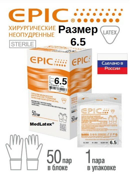 Перчатки латексные хирургические стерильные неопудренные EPIC (Россия), размер 6.5, 100 штук (50 пар).: сравнение цен, характеристики, фото, актуальное наличие и цены.