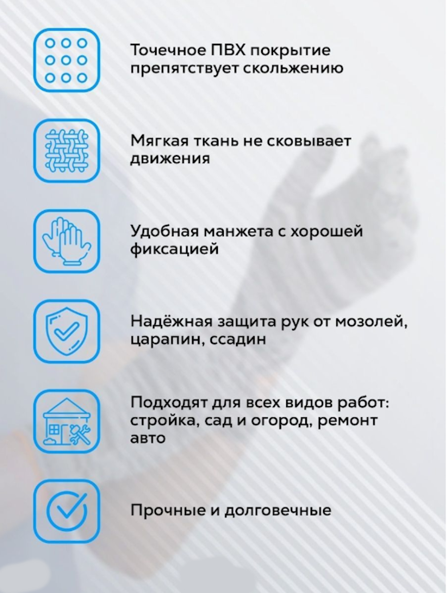 Перчатки изготовлены из хлопка, что обеспечивает комфорт и долговечность. ПВХ-нанесение обеспечивает дополнительную защиту от механических повреждений, а также от общих производственных загрязнений, воды и растворов нетоксичных веществ.