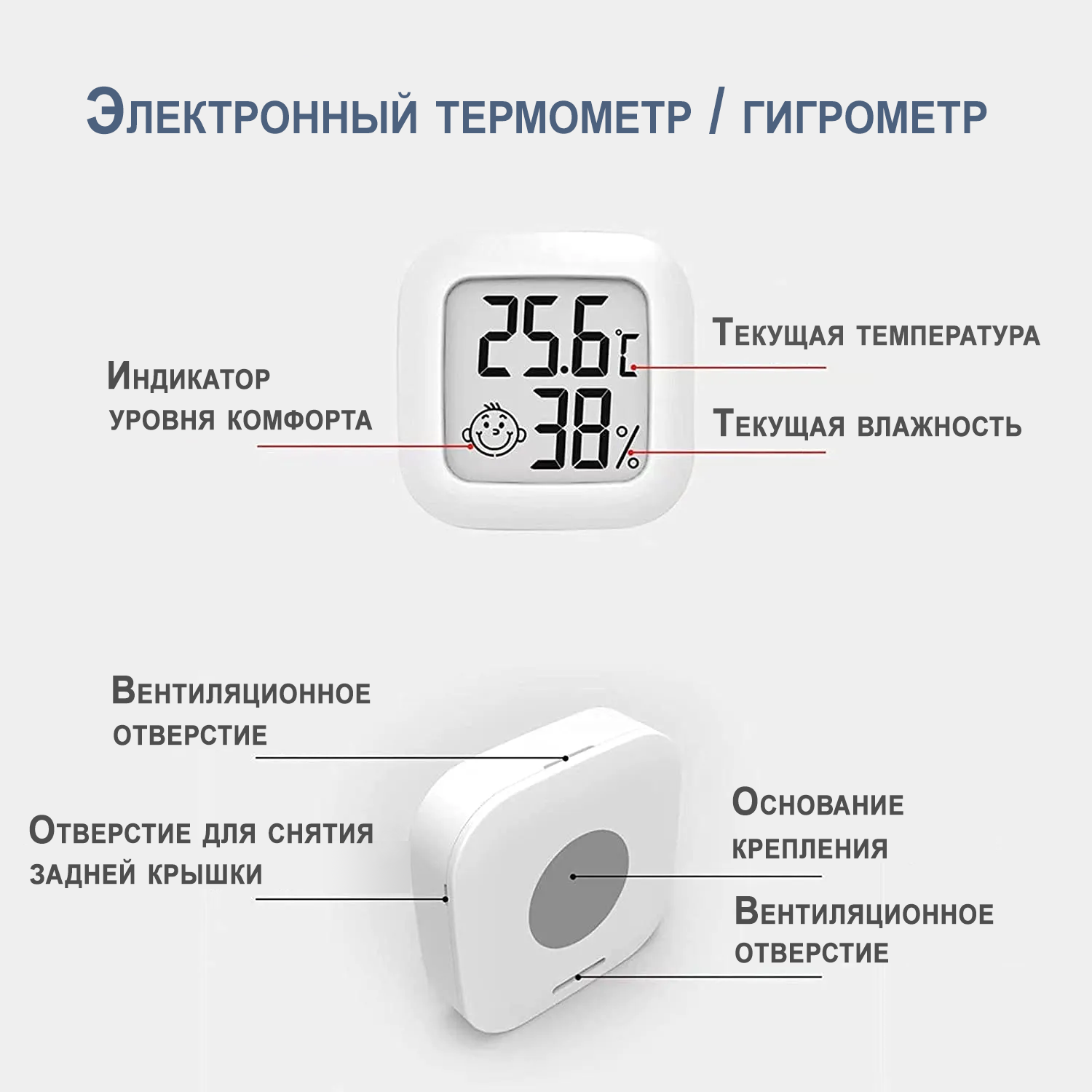 внимание! Избегать контактов горячих предметов (t>80℃) с корпусом электронного термометра/гигрометра.