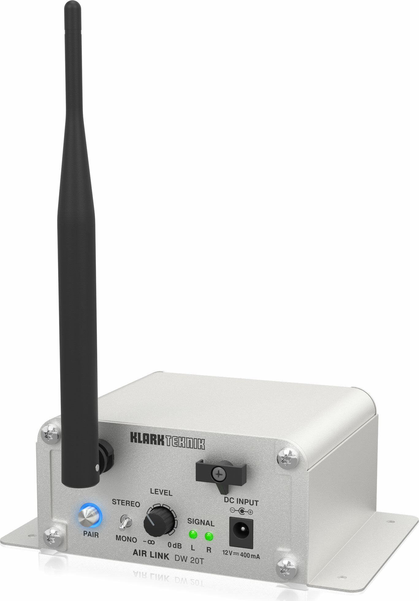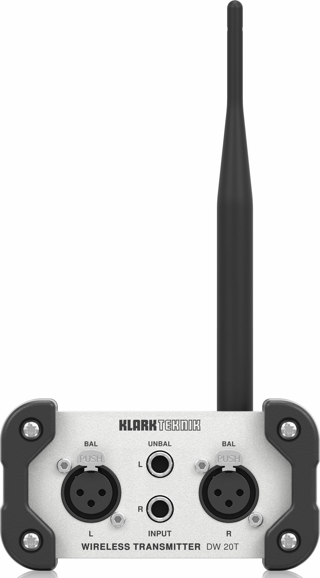 KLARK TEKNIK DW 20T передатчик стерео 2,4 ГГц, регулировка уровня, входы Jack и XLR, радиус 30 метров, крепление на стену