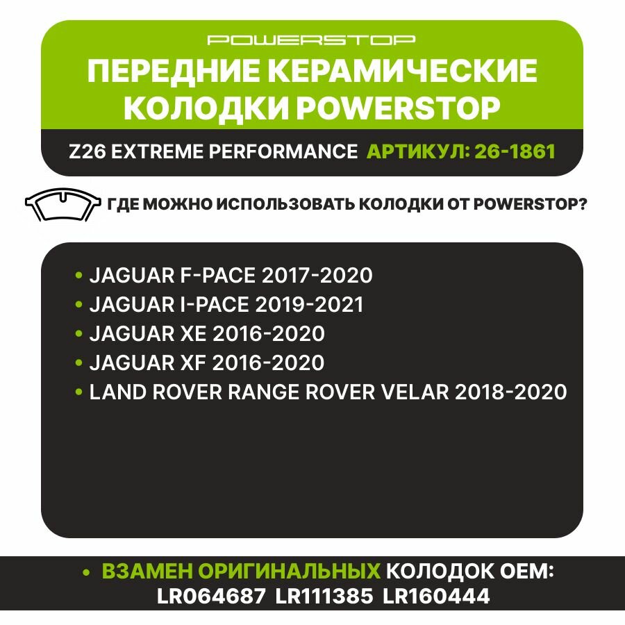 Купить Передние керамические тормозные колодки POWERSTOP Extreme Street Performance Z26 на RANGE ROVER VELAR 2018-2020 / JAGUAR I-PACE 2019-2021 с доставкой по всей России. Передние керамические тормозные колодки POWERSTOP Extreme Street Performance Z26 на RANGE ROVER VELAR 2018-2020 / JAGUAR I-PACE 2019-2021: сравнение цен, характеристики, фото, актуальное наличие и цены.