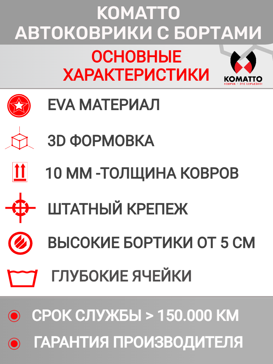 Приобретая эти коврики, вы делаете выбор в пользу качества и надежности. Они обеспечивают комфорт при использовании и защищают оригинальные покрытия вашего автомобиля, продлевая срок службы салона. Выберите передние ковры с бортами 3D EVA и наслаждайтесь чистотой и стилем в вашем автомобиле.
