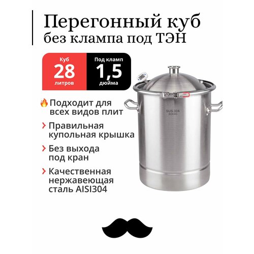 Перегонный куб без врезок 28 литров, 30×40 см, 304-я сталь, под колонну 1,5 дюйма (куб без клампа и выхода под кран): сравнение цен, характеристики, фото, актуальное наличие и цены.