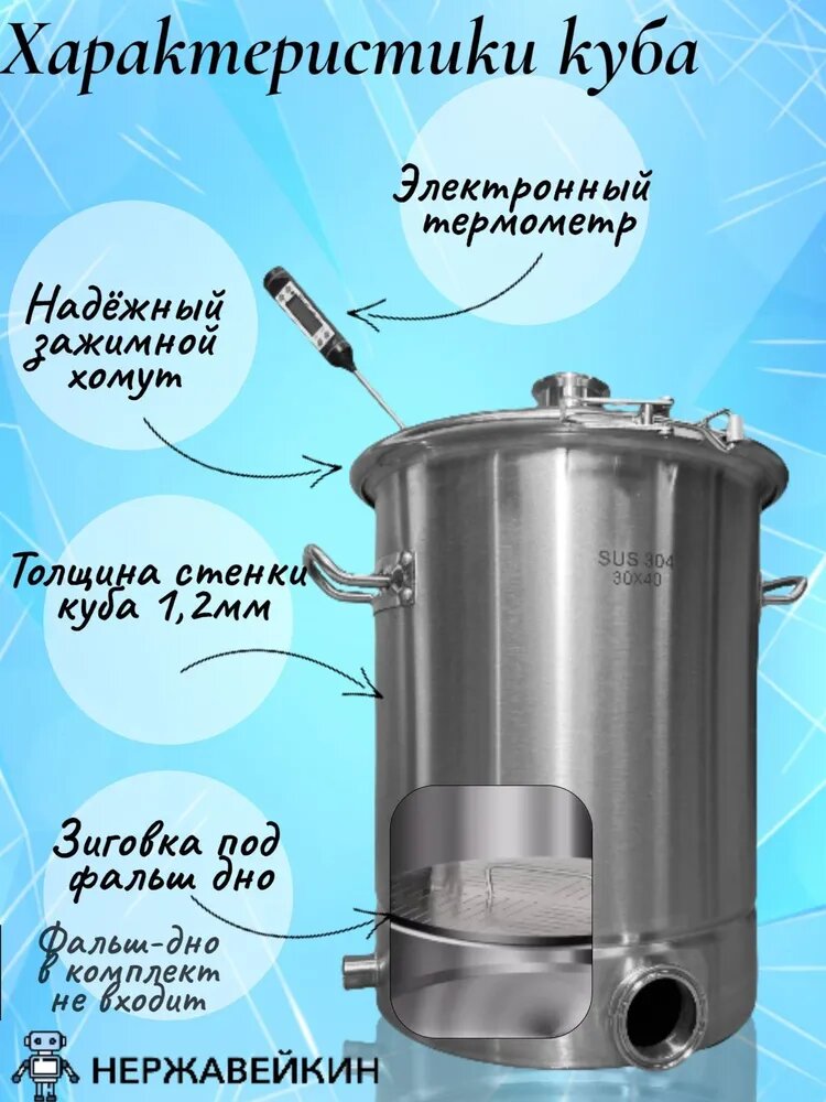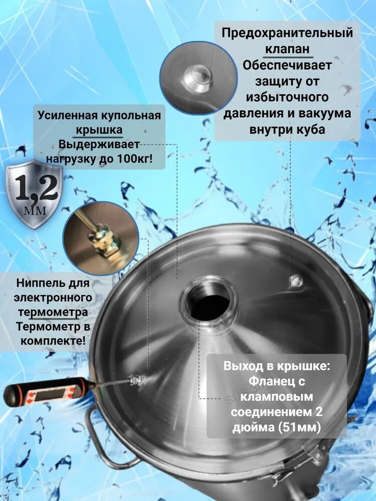 Перегонный куб люкс 40 литров, 36х40 см, нержавеющая сталь 304 AISI, кламп под ТЭН, выход в крышке 2 дюйма: сравнение цен, характеристики, фото, актуальное наличие и цены.